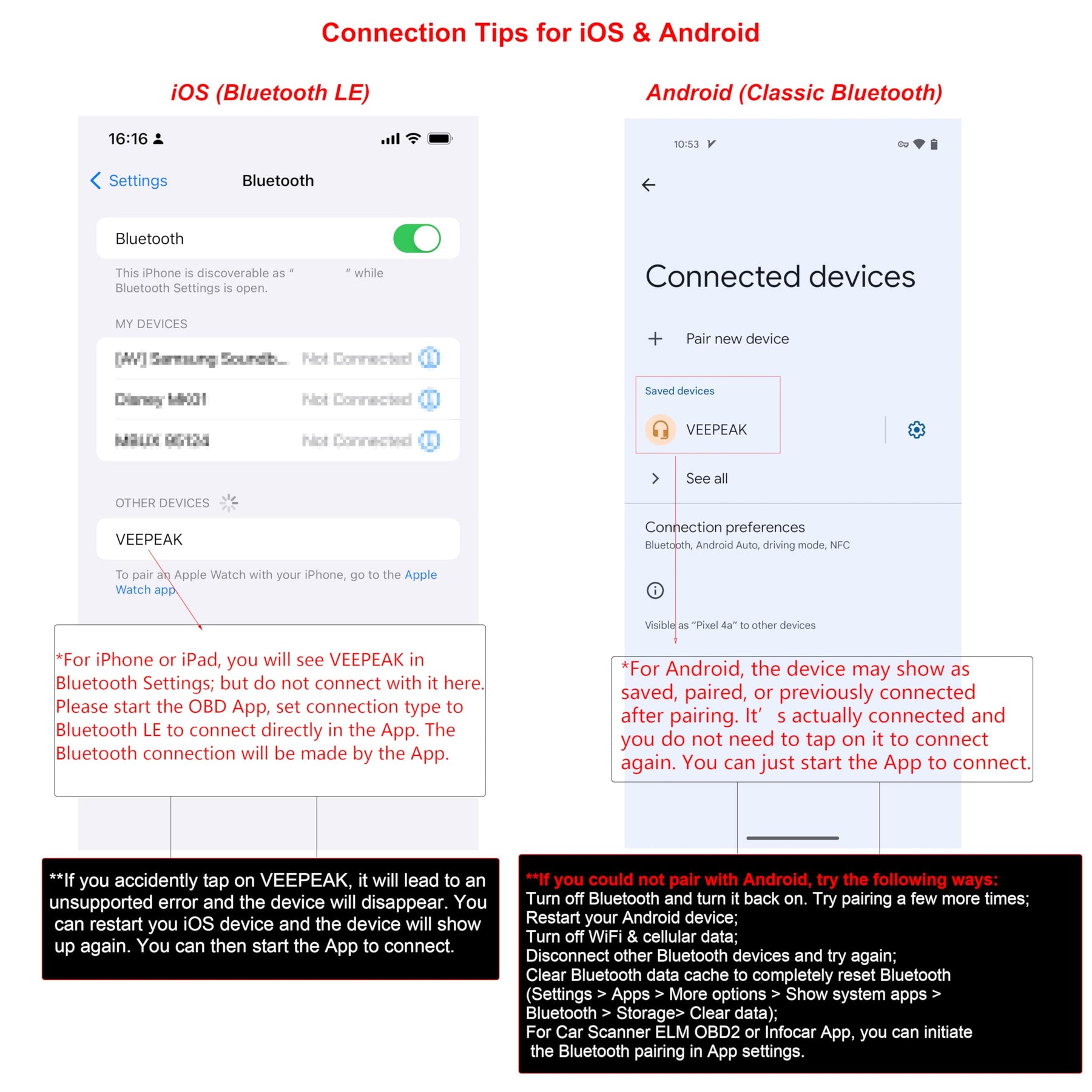 - DEVICE COMPATIBILITY - Compatible with iOS via Bluetooth LE (do NOT connect with the device in iOS Bluetooth Settings; please connect directly in the OBD2 Apps) & Android devices via Classic Bluetooth (head units may not be compatible; for some Android phones in recent years, it may not show as connected after pairing but you can still start the App to connect). For detailed iOS and Android connection & troubleshooting guide, please refer to the fifth product image or user instructions.