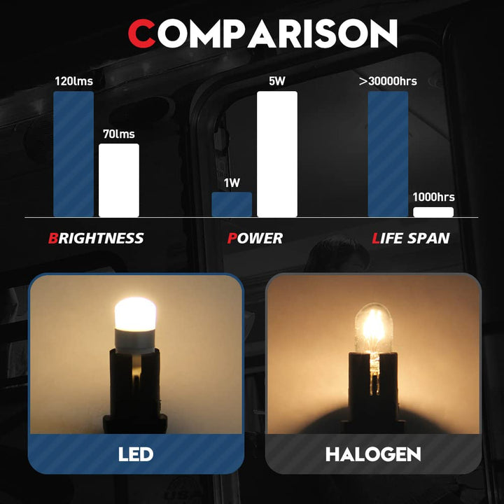 - Each T10 wedge base LED light lamp comes with 1 piece 3030 chip under milky cover, delivers well-distributed light of soft warm white and outputs 120 lumens at 1 watt low power consumption. Each pack contains 20 pieces 194 LED bulbs. Commonly used for car map light, dome light, license plate light, instrument panel light, gauge cluster light, dashboard light, and more.