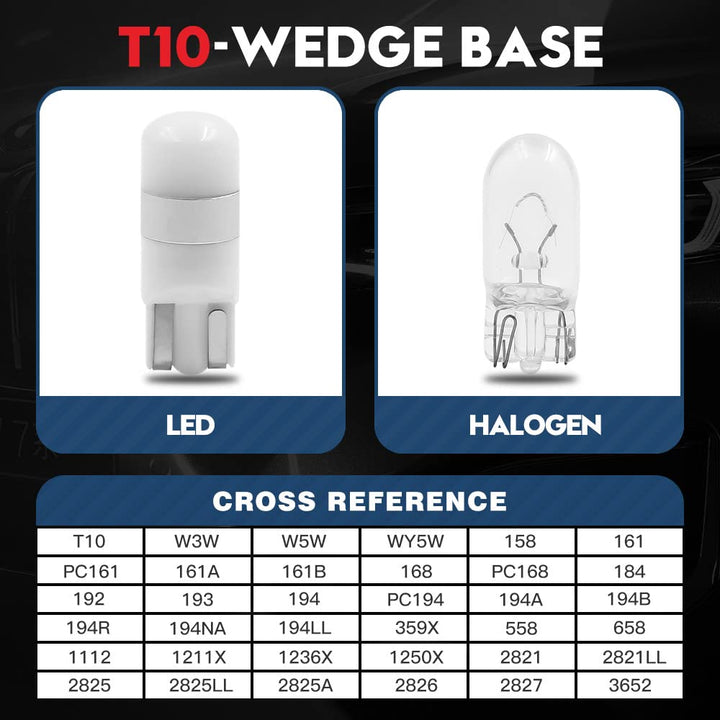 - Direct replacement for all T10 or T15 wedge miniature base: W3W, W5W, WY5W, 158, 161, PC161, 161A, 168, PC168, 184, 192, 193, 194, PC194, 194R, 194A, 194B, 194NA, 194LL, 359X, 558, 658, 1112, 1211X, 1236X, 1250X, 2821, 2821LL, 2825, 2825LL, 2825A, 2826, 2827, 2886X, 3652, T15, W16W, PC579, 579, 901, 904, 906, 906NA, 912, 912B, 912NA, 912LL, 915, 916, 916NA, 917, 918, 920, 921NA, 921Y, 921, 921LL, 922, 923 and more.