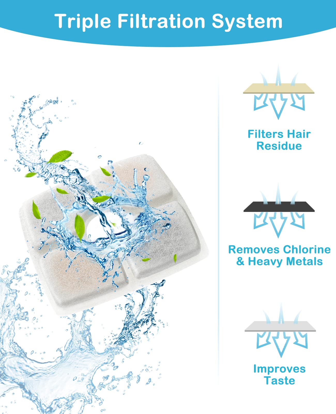 - Keep Your Pet HealthyEach filter is composed of activated carbon, ion exchange resin and non-woven fabric. They can filter hair, heavy metals, and improve the taste of the water so that pets can drink clean and fresh water all day, which helps to increase water consumption and reduce the risk of urinary tract infections.