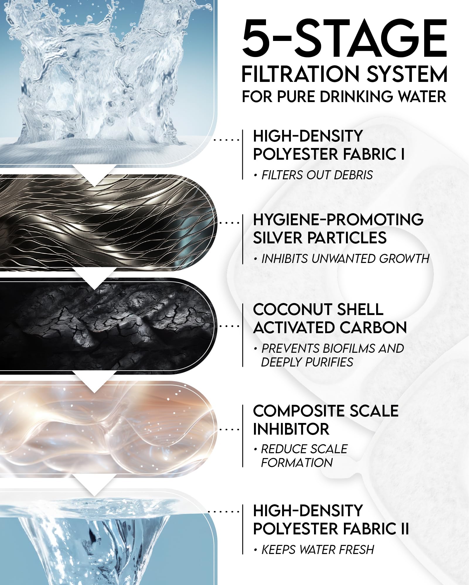 - 5 stages filtration system: In addition to keeping water fresh via circulation, the 5 stages system, including silver and coconut shell activated carbon, along with a unique composite scale inhibitor, keeps water better tasting and safer for pets.