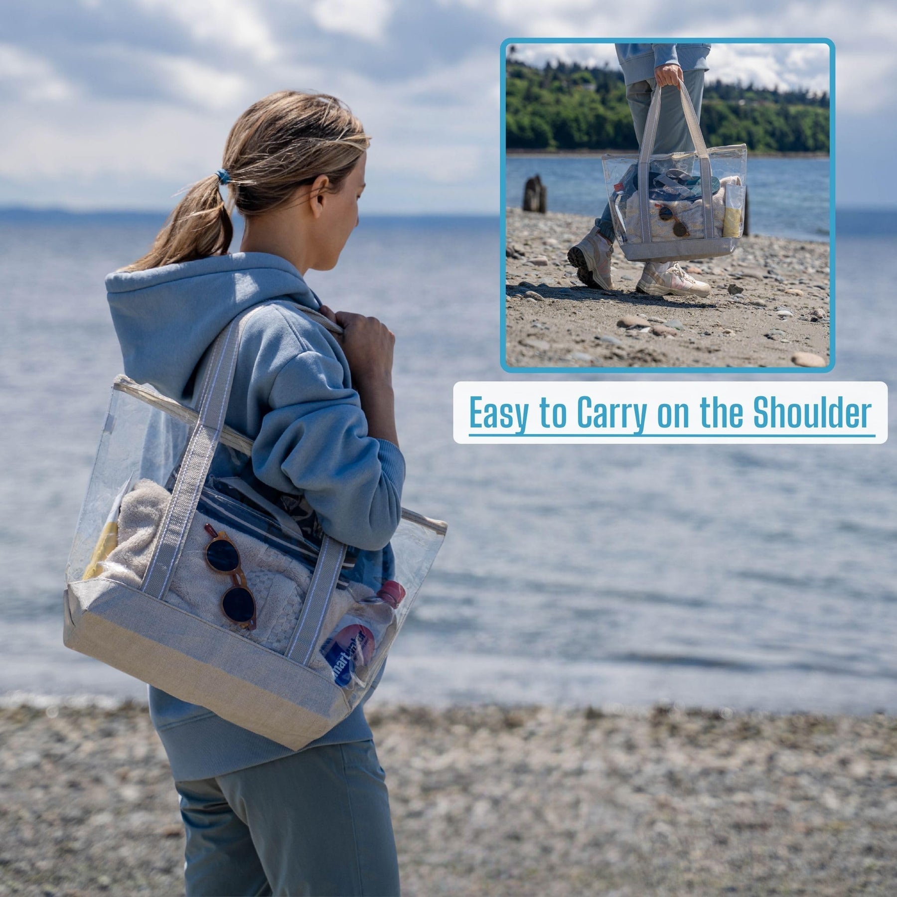 - Clear Bag for Events, Concerts, and More! - This clear bag measures 19.7” top width, 14.2 bottom width, 13.7” height, and 6” depth, and offers a 4.8-gallon capacity. Its spacious compartment, with a secure zipper, is perfect for beaches, pools, and outdoor events, aligning with security requirements. Ideal for women, this lightweight transparent concert bag is also a stylish clear beach tote, ensuring you’re prepared for any event while keeping essentials at hand.