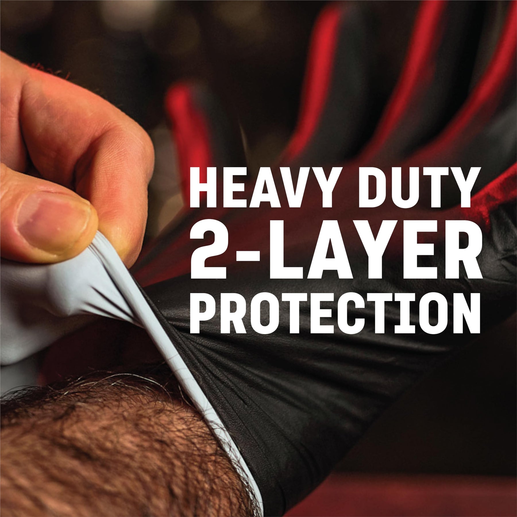 - Heavy duty disposable gloves have 2 premium nitrile layers; black outer layer with break through indicating white inner layer