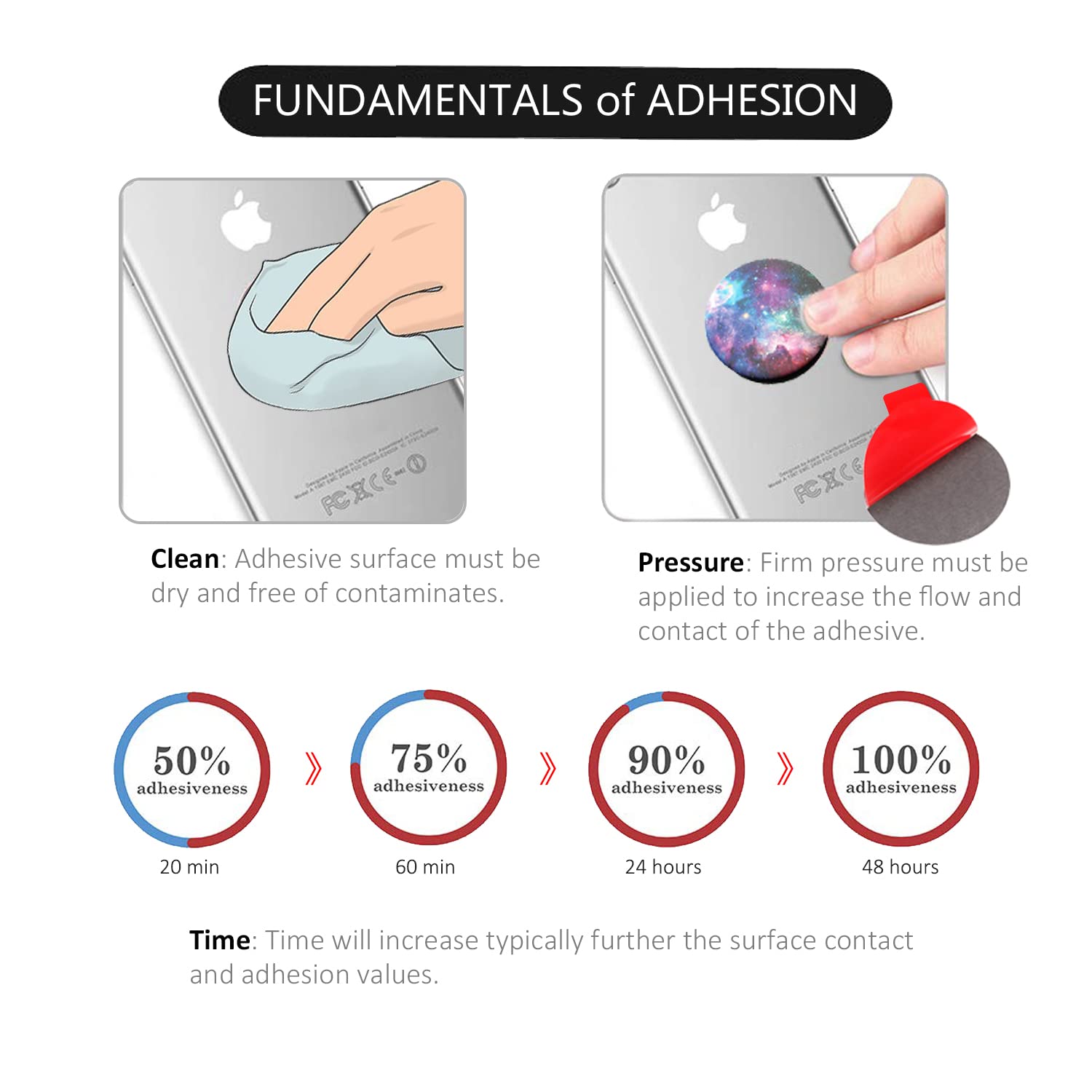 - Easy to UseTo maximize adhesive contact, please clean the adhesive surface before use and let it dry, free of contaminates. And wait at least 24 hours to use after stuck. First peel off the white side of the adhesive and stick it to the collapsible grip base. After applying some pressure on the adhesive, peel off the red film side of the adhesive and stick the collapsible grip to your phone case.