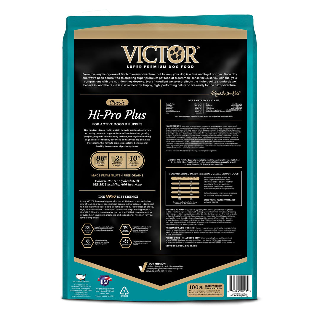 - FROM PUPPY TO ADULT: Suitable for all life stages, this premium dog food is ideal for pregnant dogs, lactating females and puppies; VICTOR Hi-Pro Plus for Dogs is formulated to meet the nutritional levels established by the AAFCO Dog Food Nutrient Profiles for All Life Stages, except for growth of large size dogs (70 lb. or more as an adult)