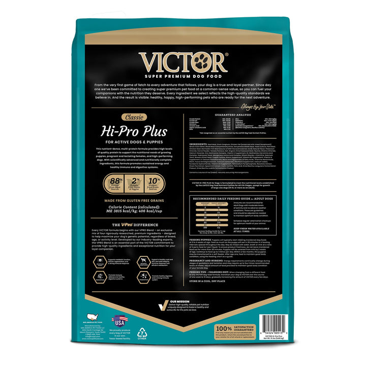 - ACTIVE DOG FOOD: VICTOR’s Hi-Pro Plus formula is a gluten free, high protein dog food with a nutrient-dense, multi meat formula; this dry dog food’s super premium nutrition provides sustained energy for sporting dogs and dogs with high physical demands