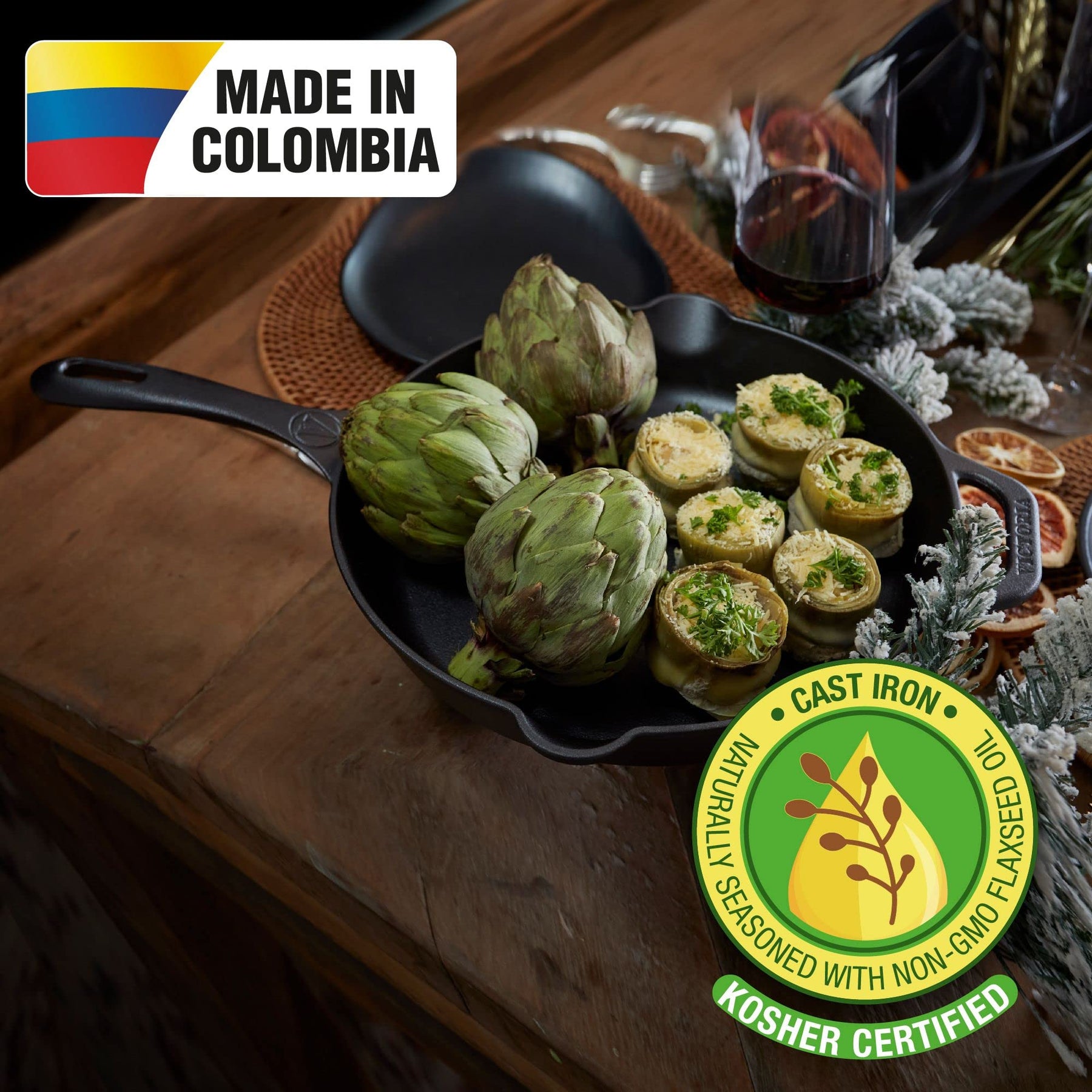 - Original Skillets – Cast Iron Skillet Large Frying Pan with Helper Handle Seasoned with 100% Kosher Certified Non-GMO Flaxseed Oil, 12 Inch, Black by Victoria