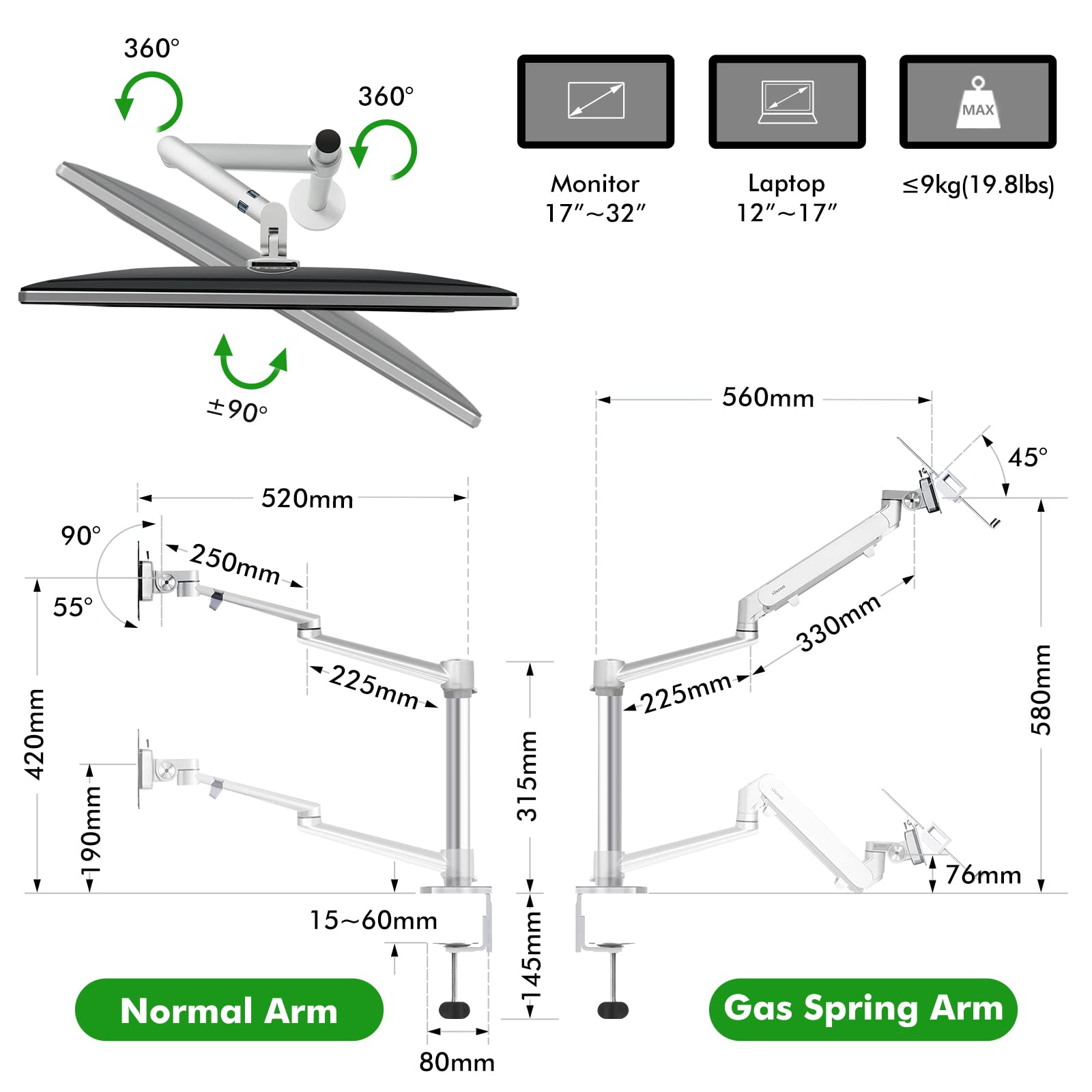 - Adjustable Height&Angle The monitor can freely swivel 360 degree, easily adjust the monitor and laptop to the most comfortable position. Monitor mounting arm offers 145 degree tilt, the maximum extension length up to 20.5. Laptop mounting arm offers 45 degree tilt, the maximum extension length up to 22. The height range of normal arm: 7.5-16.5; height range of gas spring arm: 3-22.8. Use the gas spring arm to easily adjust height you want.