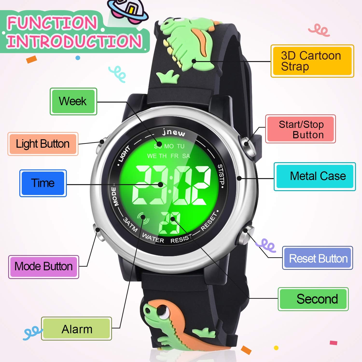 - Fashion Multifunctional: The digital watch with the functions of 3ATM waterproof, shockproof, stopwatch, alarm clock, week, date, back light, calendar, 12H/24H time can describe time from a variety of angles, help kids develop the good habits of valuing time and reading time.
