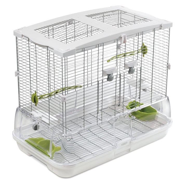 - Includes two waste shields, two green bird seed and water dishes, and two green bird perches