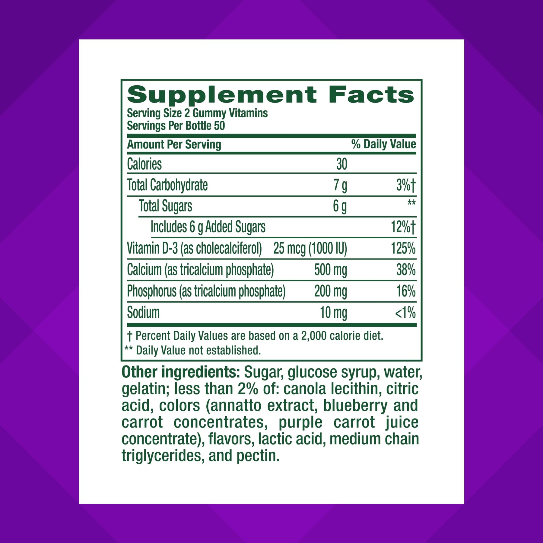 - Each two-gummy serving of this Calcium with Vitamin D supplement contains 500 mg of Calcium—as much as 12 oz of milk—and 1,000 IU of Vitamin D