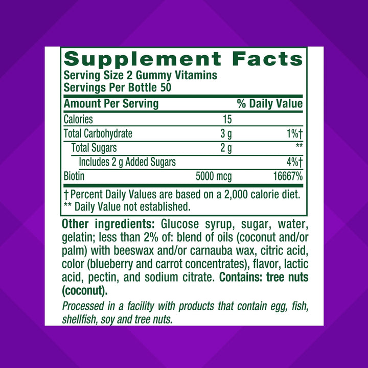 - One 100 count bottle of vitafusion Extra Strength Biotin Gummy Vitamins, blueberry flavored vitamin gummy (1), enough Biotin vitamins for 50 days