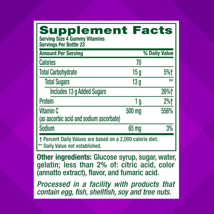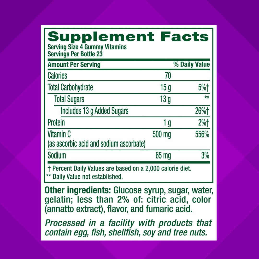 - Immune Support (1): Each four-gummy serving has 500 mg of Vitamin C to help with immune support (1) giving you the same amount of Vitamin C as 18 tangerines in easy-to-eat gummies