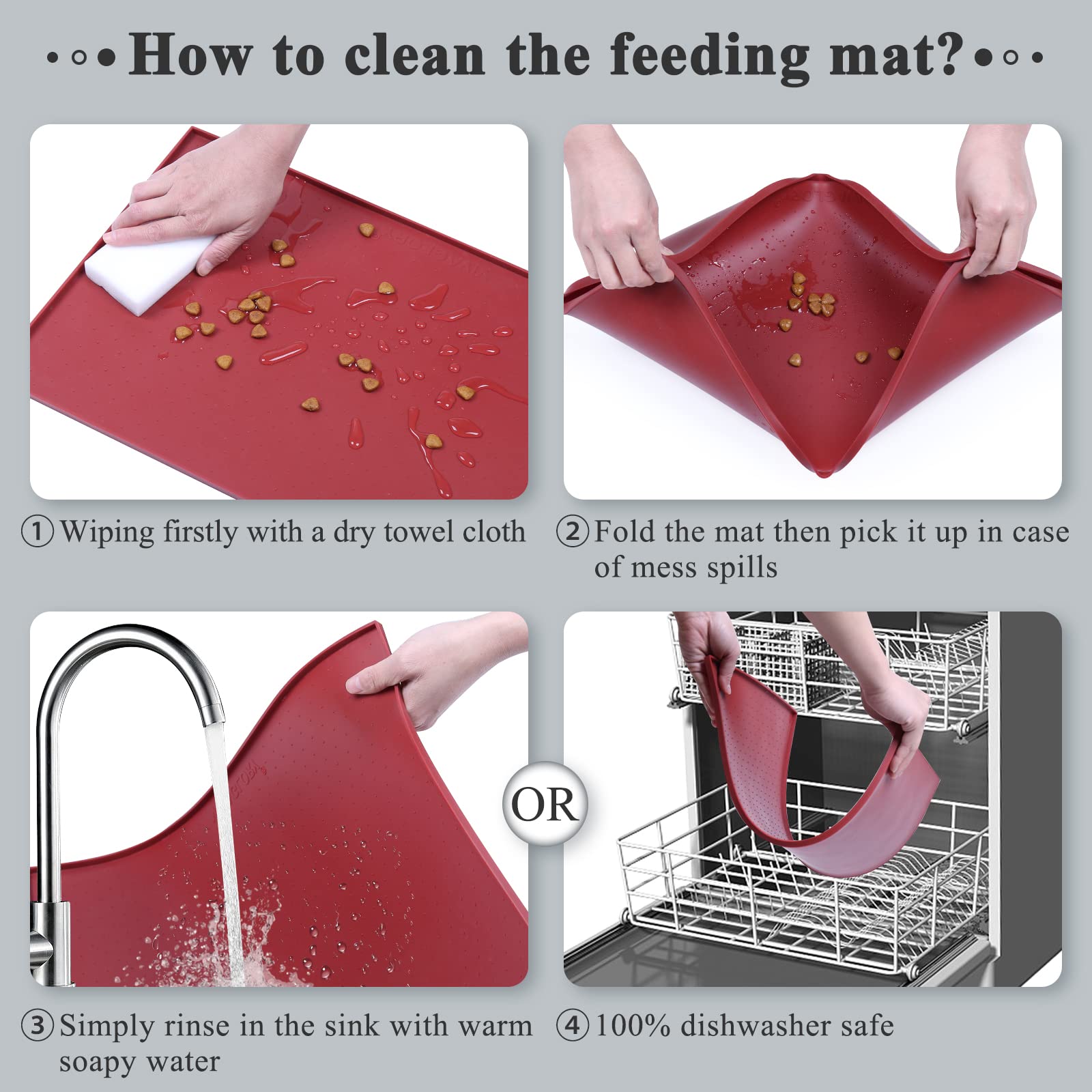 - EASY TO USE & CLEAN : This dog mat for food and water is very easy to clean, simply rinse in the sink with warm soapy water, wipe with a cloth, wash it by hand under the sink or in a dishwasher. If a lot of water was spilt on mat, please kindly wiping firstly with a dry towel cloth. Thus the water would not spilled onto the floor when taking to clean.