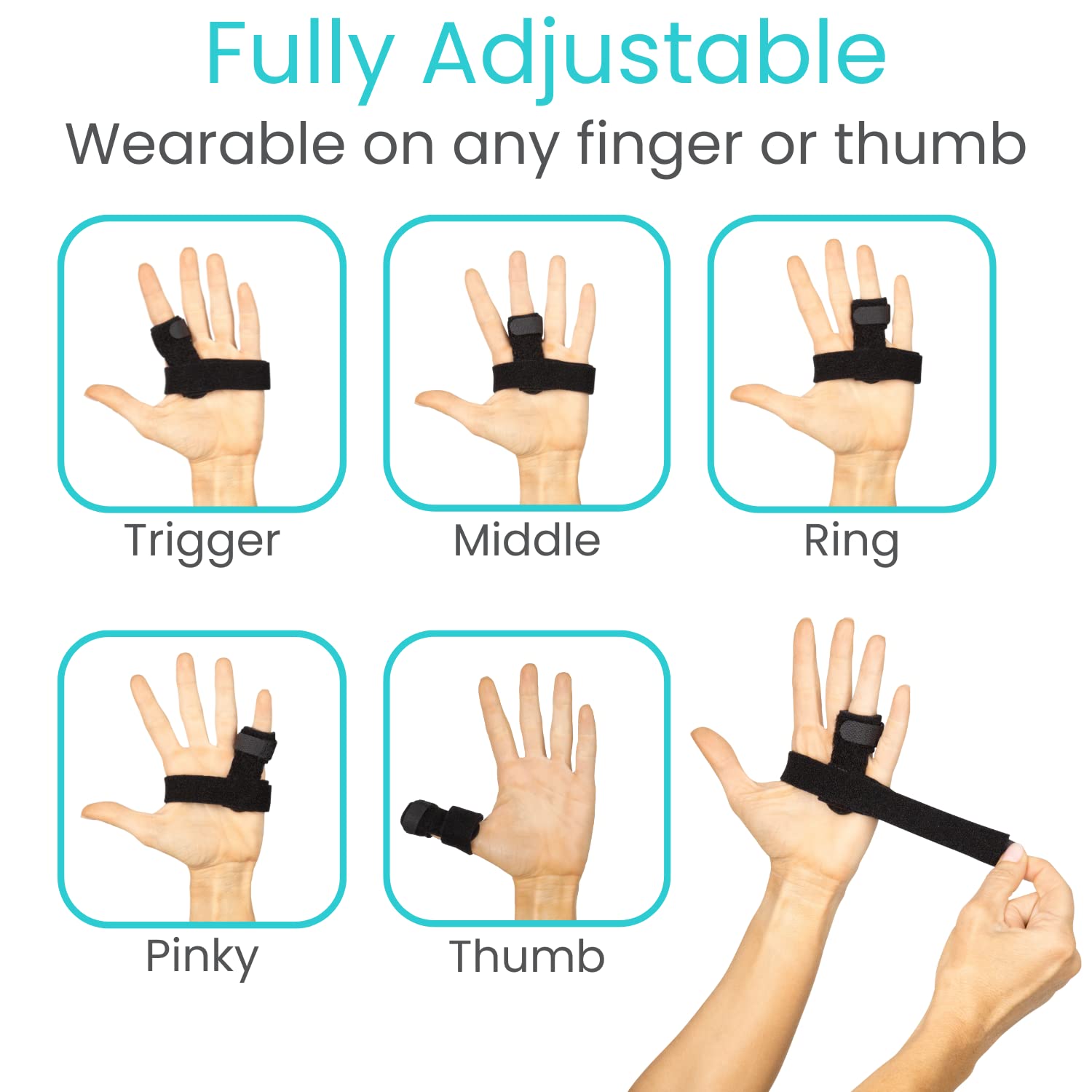 - WEAR ON ANY FINGER OR THUMB: Designed for use on the pinky, ring, middle and index finger or on the thumb, the Vive trigger finger splint provides stabilizing support on the left or right hand as needed. The versatile splint features an adjustable strap to fit any finger up to 4” in circumference and a second palm strap that adjusts up to 12” in circumference.
