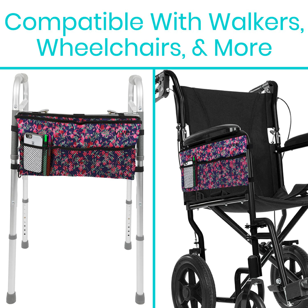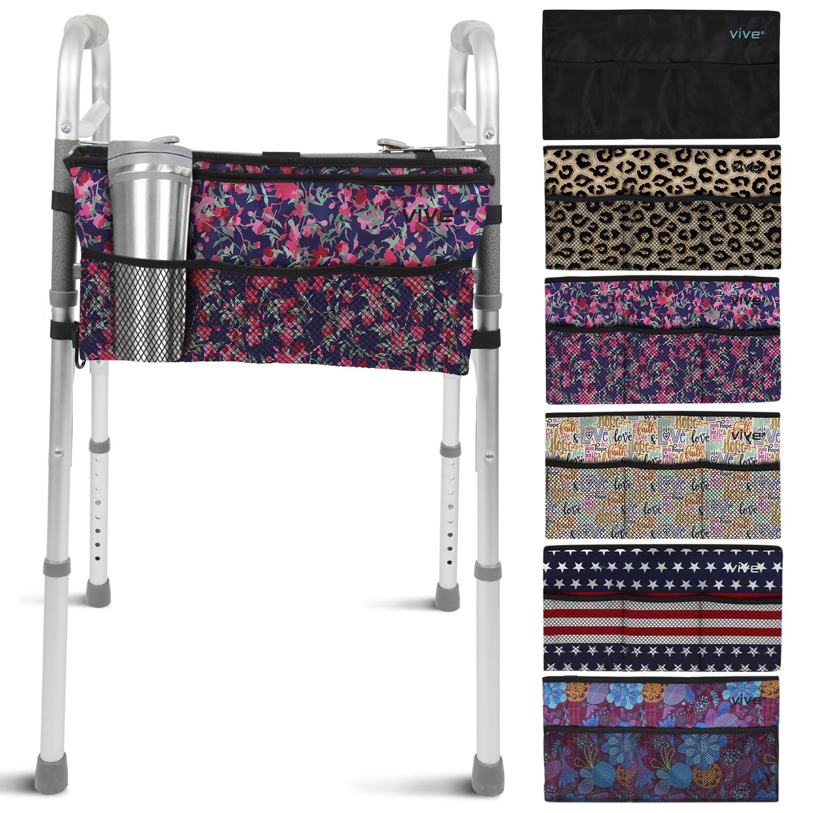 - FITS ALL WALKER STYLES: Adjustable loop fasteners allow the Vive walker bag to easily attach to the front of any walker style and width, including bariatric walkers, standard walkers and dual-point folding walkers.
