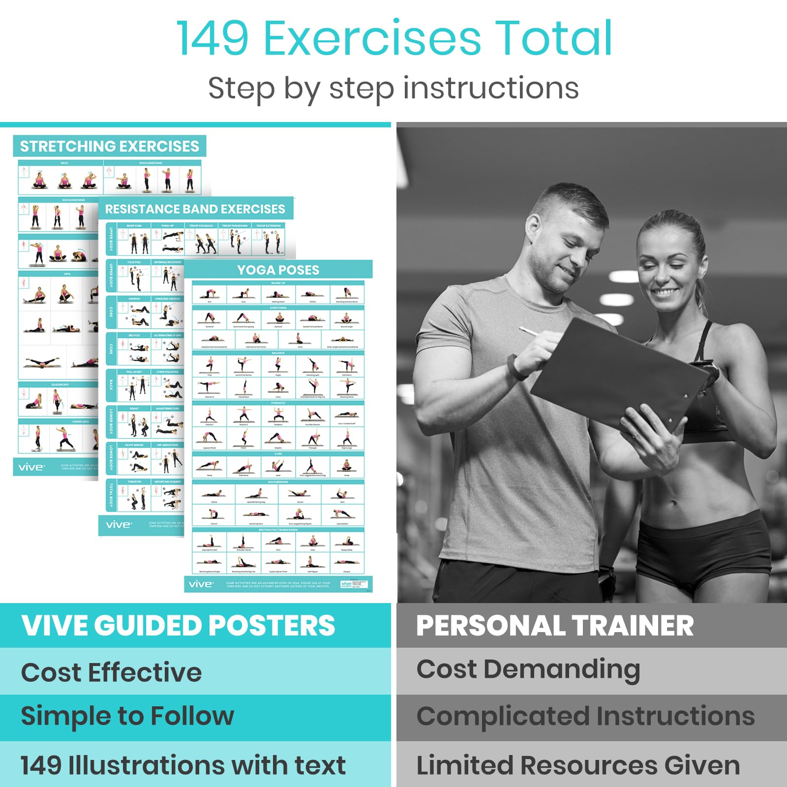 - Designed to Improve Flexibility: Regain and maintain flexibility with the Vive workout poster set. Displaying 149 illustrated movements, the flexibility poster set allows you to stretch out every area from the neck and shoulders to the feet in a safe manner. The set includes a resistance band poster with targeted and total body workouts to stretch and strengthen your muscles, a stretching poster with full-body stretches, and a yoga poster with poses.