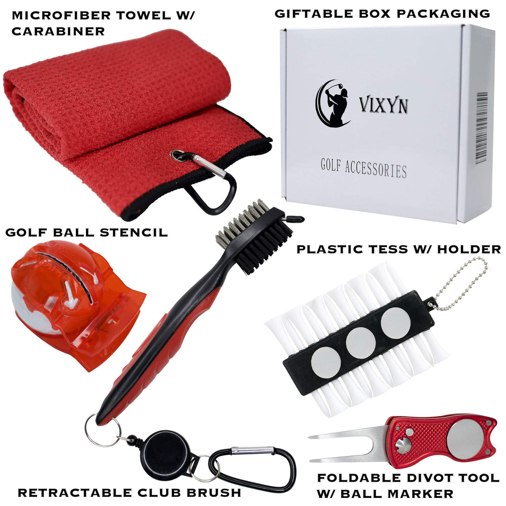 - Original Golf Club Bag Accessories – Golf Accessories Gift Set - Golf Towel, Golf Club Brush with Groove Cleaner, Foldable Divot Repair Tool with Ball Marker, Golf Ball Line Marker and Tees with Holder - Golf Club Cleaning Kit by VIXYN