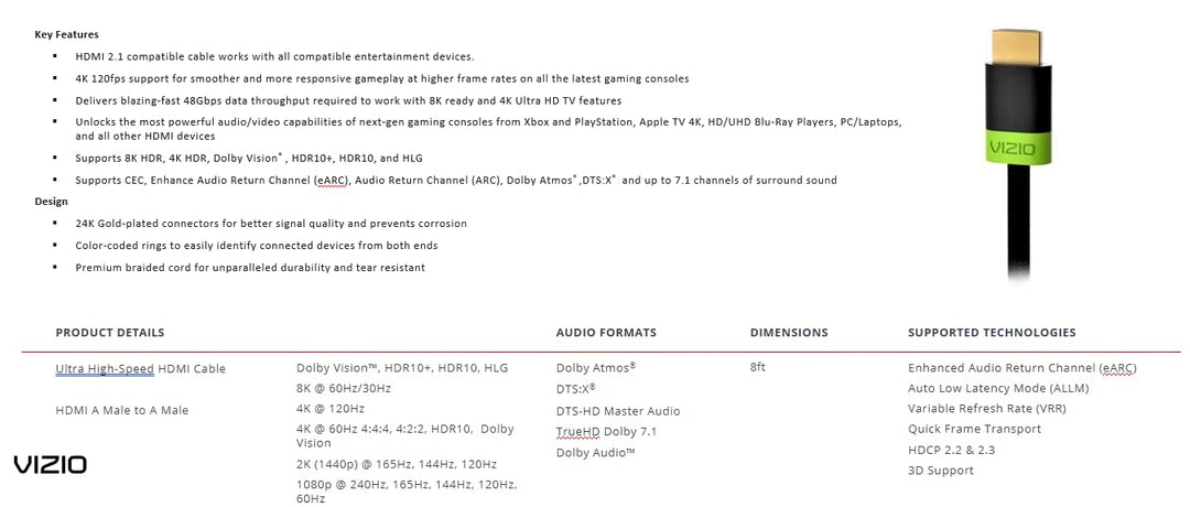 - Original HDMI Cables – XHC21-81G 8Ft. Ultra High-Speed HDMI 2.1 Specification Cable by VIZIO