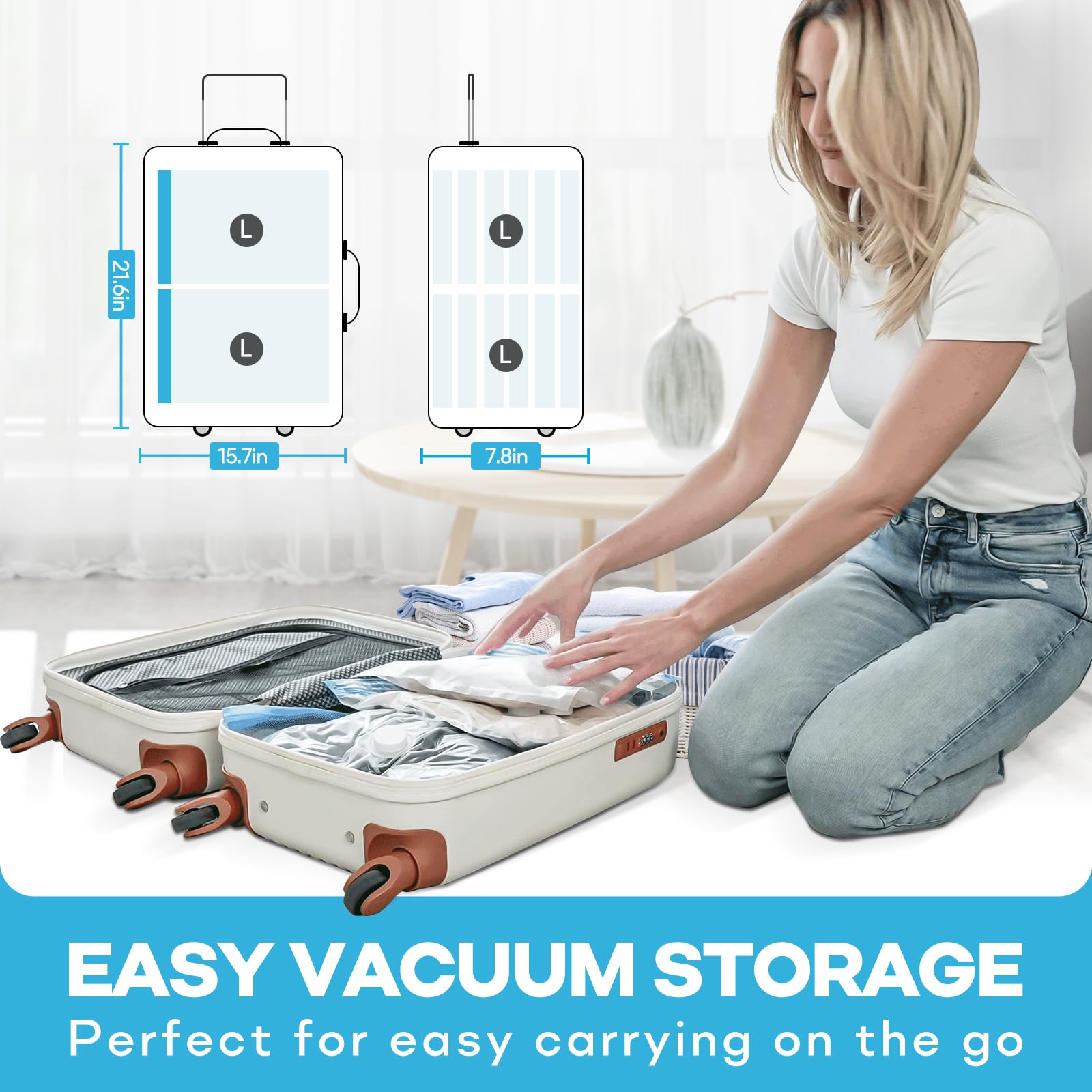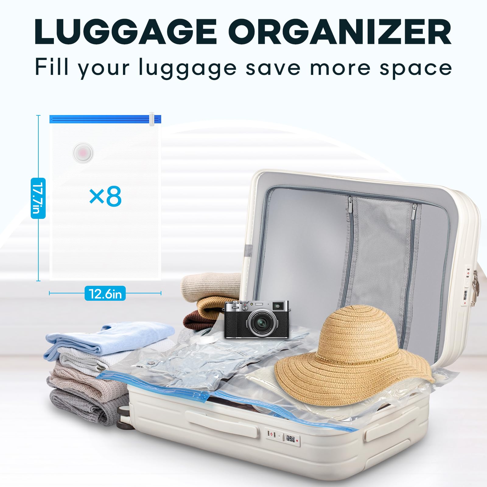 - MORE SPACE: Save up to more space in your suitcase, backpack . Pack of 8 travel vacuum storage bags: 8 XL (17.7 x 12.6) Perfect for Thin coat, towels, T-shirt ,sock,underwear etc.