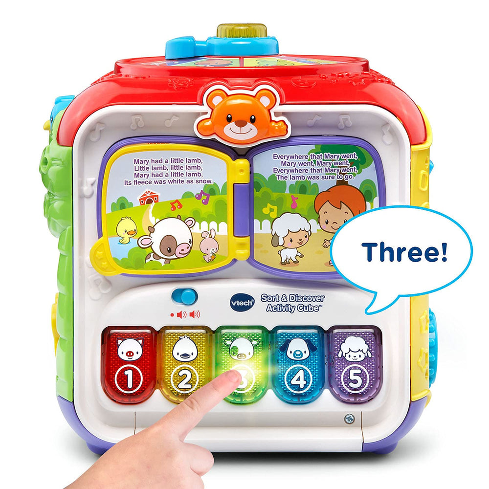 - The sort and discover activity cube features five sides of fun activities; features 75+ songs, sounds, melodies and phrases and instruction-clean with a damp cloth