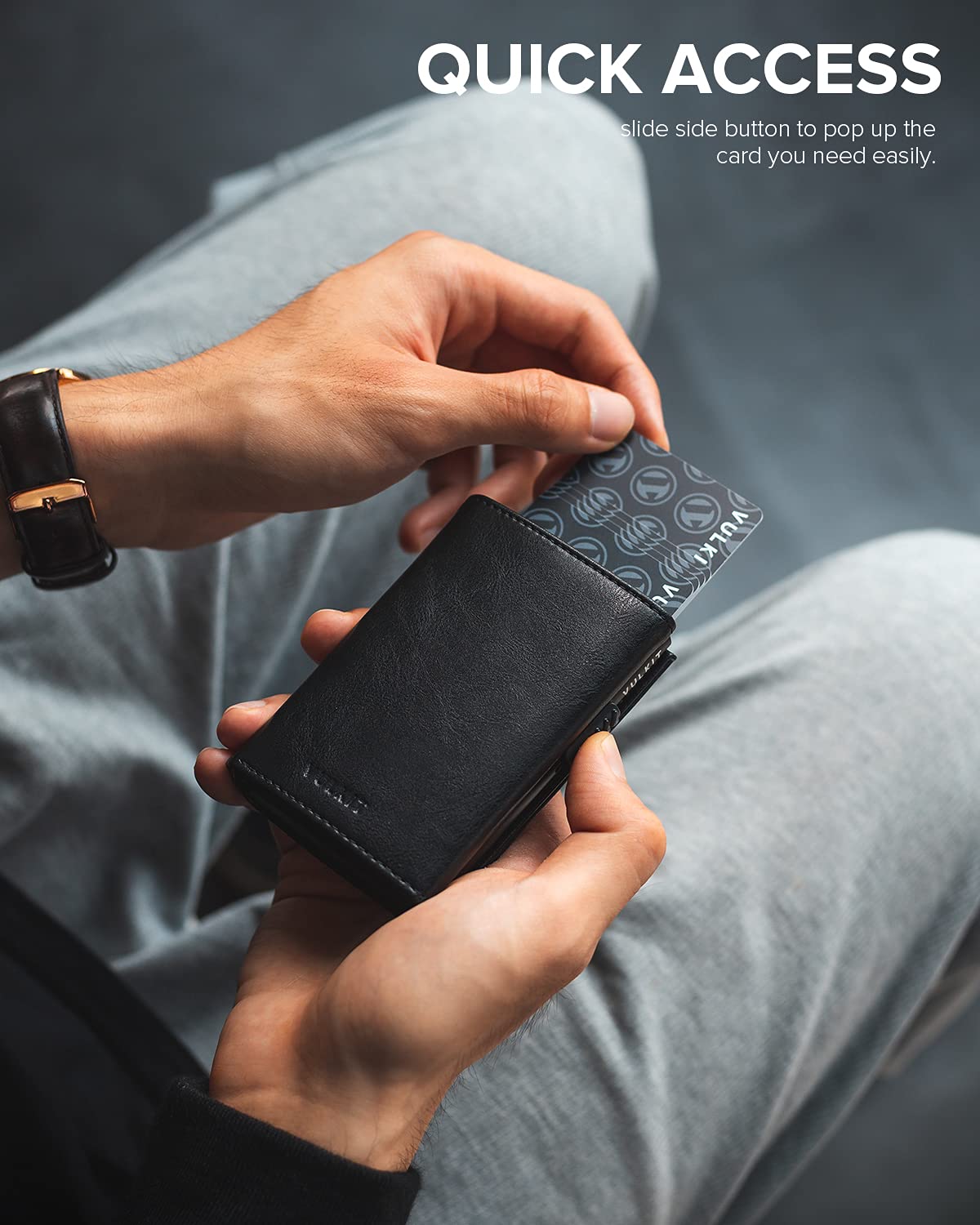 - QUICK ACCESS POP UP CARDS: Easy slide the button and get the neat pop-up cards. Cards hold well in card case and they won't drop out.