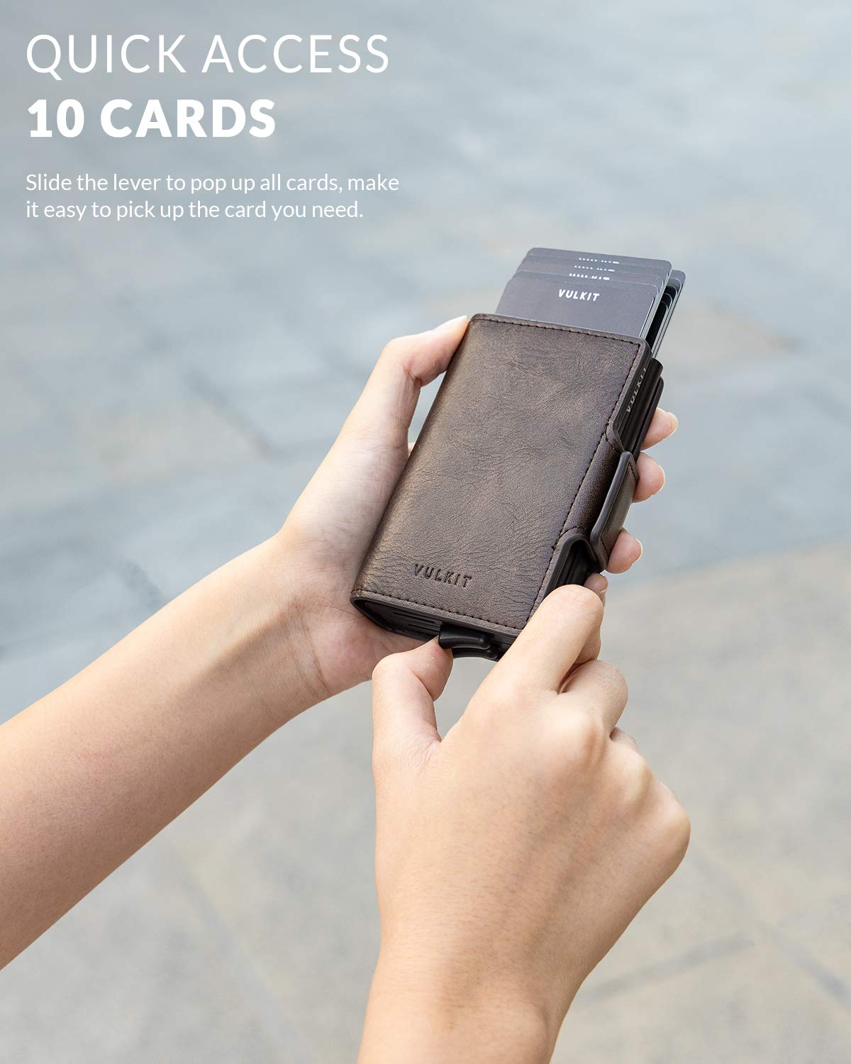 - QUICK ACCESS 10 CARDS: slide over the lever the cards pop out in a tiered fashion where you can easily access any of the cards stored in there.