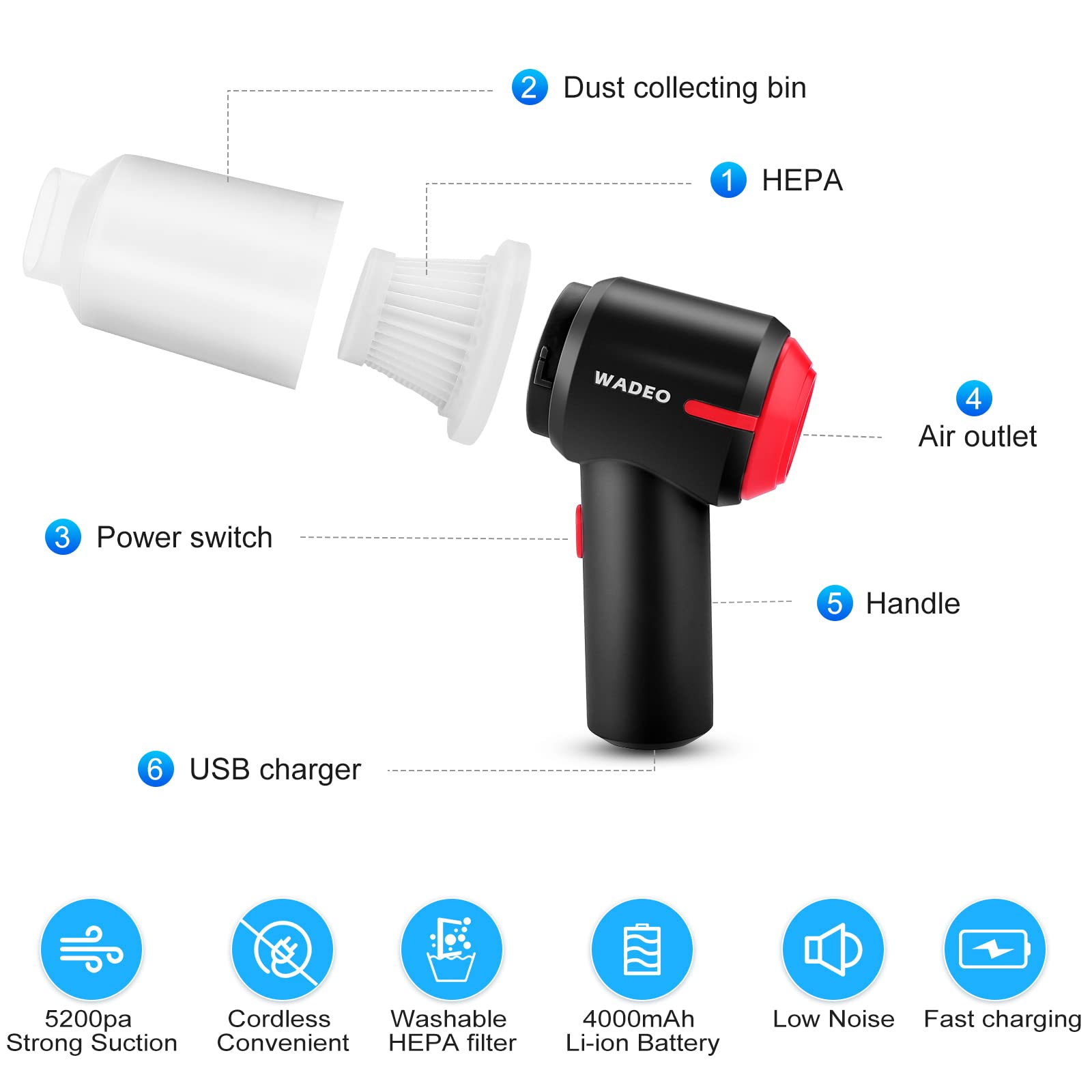 - 3-in-1 Multifunctional Vacuum Cleaner : WADEO handheld vacuum cleaner can be used in home/office/car/bathroom/carpet/keyboard vacuum cleaning; Can be used as an inflatable pump to inflate the swimming ring; Can be used as a vacuum pump for clothes, mattress, blanket, pillows.