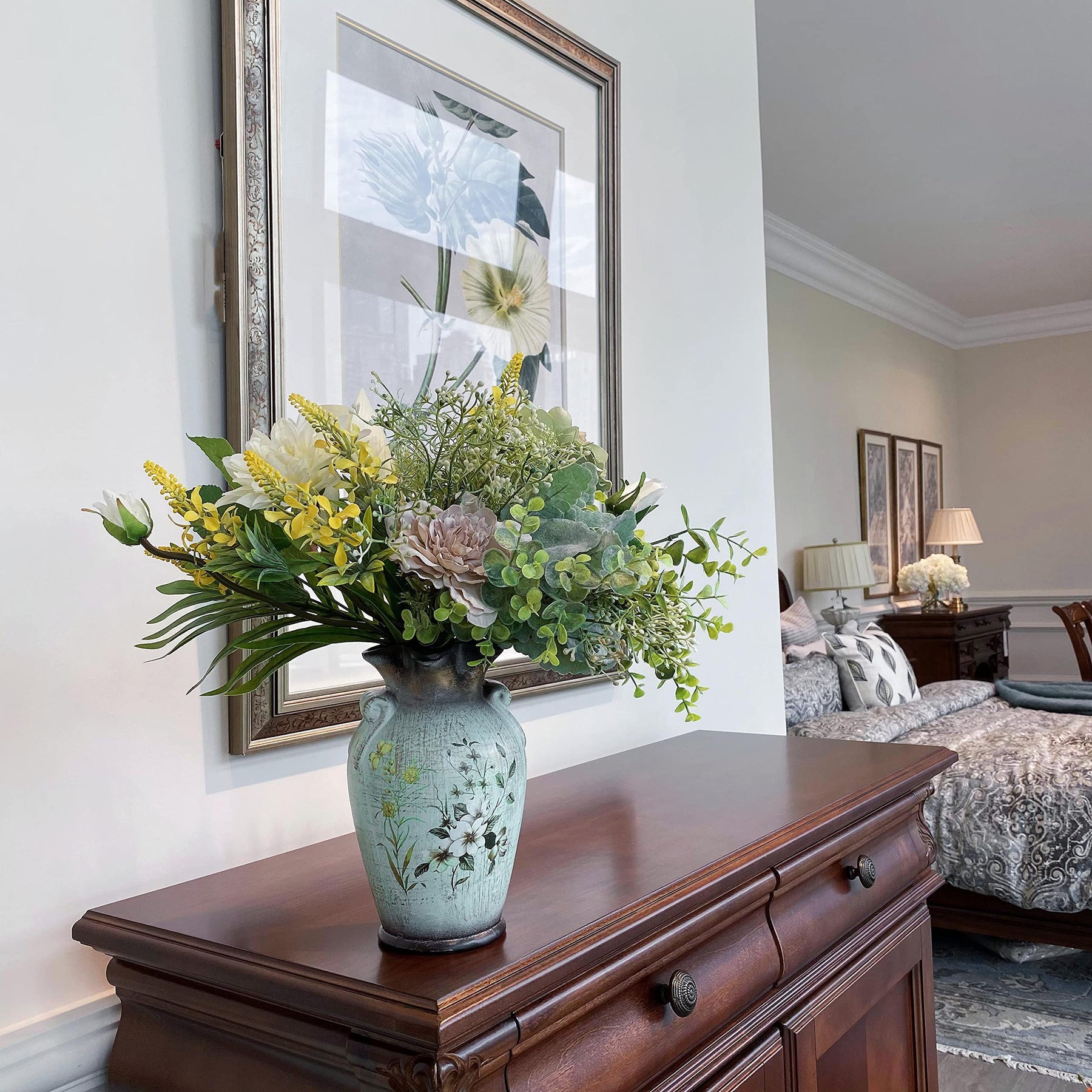 - Versatile: An ideal deco for various scenarios including living room, bathroom, coffee table, centerpieces for dining room table, farmhouse kitchen counter, rustic deco, etc. The flower arrangement alone can be used as the wedding bouquets for bride.