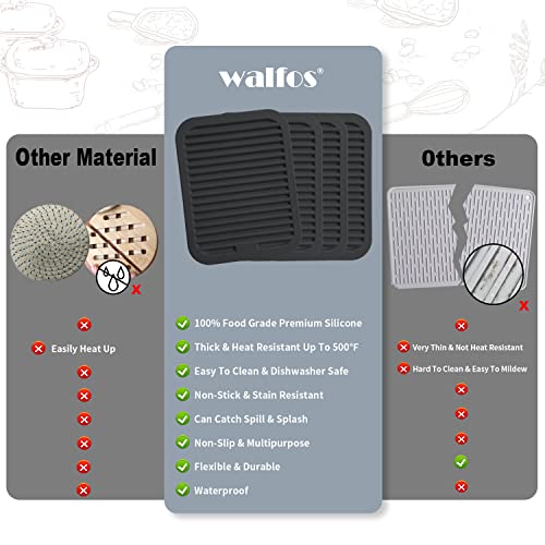- EASY TO CLEAN UP: Walfos heat resistant mats for countertop can hand-wash or toss it in the dishwasher. Virtually everything washes off the nonstick surface with ease, dry the silicone hot pads quickly. Size: 12'' x 9'' x 0.22''