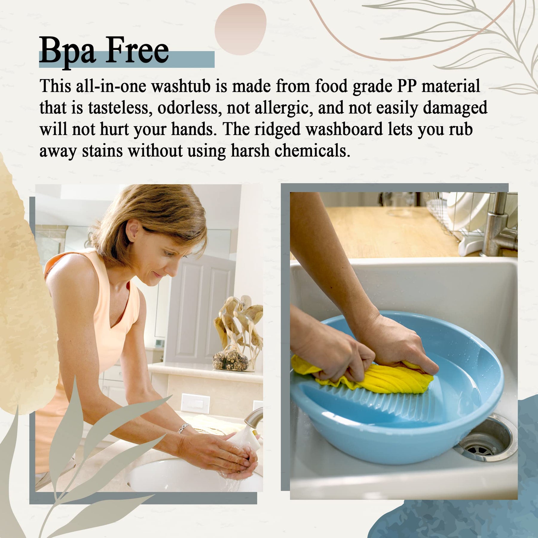 - BPA Free: This all-in-one washtub is made from food grade PP material that is tasteless, odorless, not allergic, and not easily damaged will not hurt your hands. The ridged washboard lets you rub away stains without using harsh chemicals.