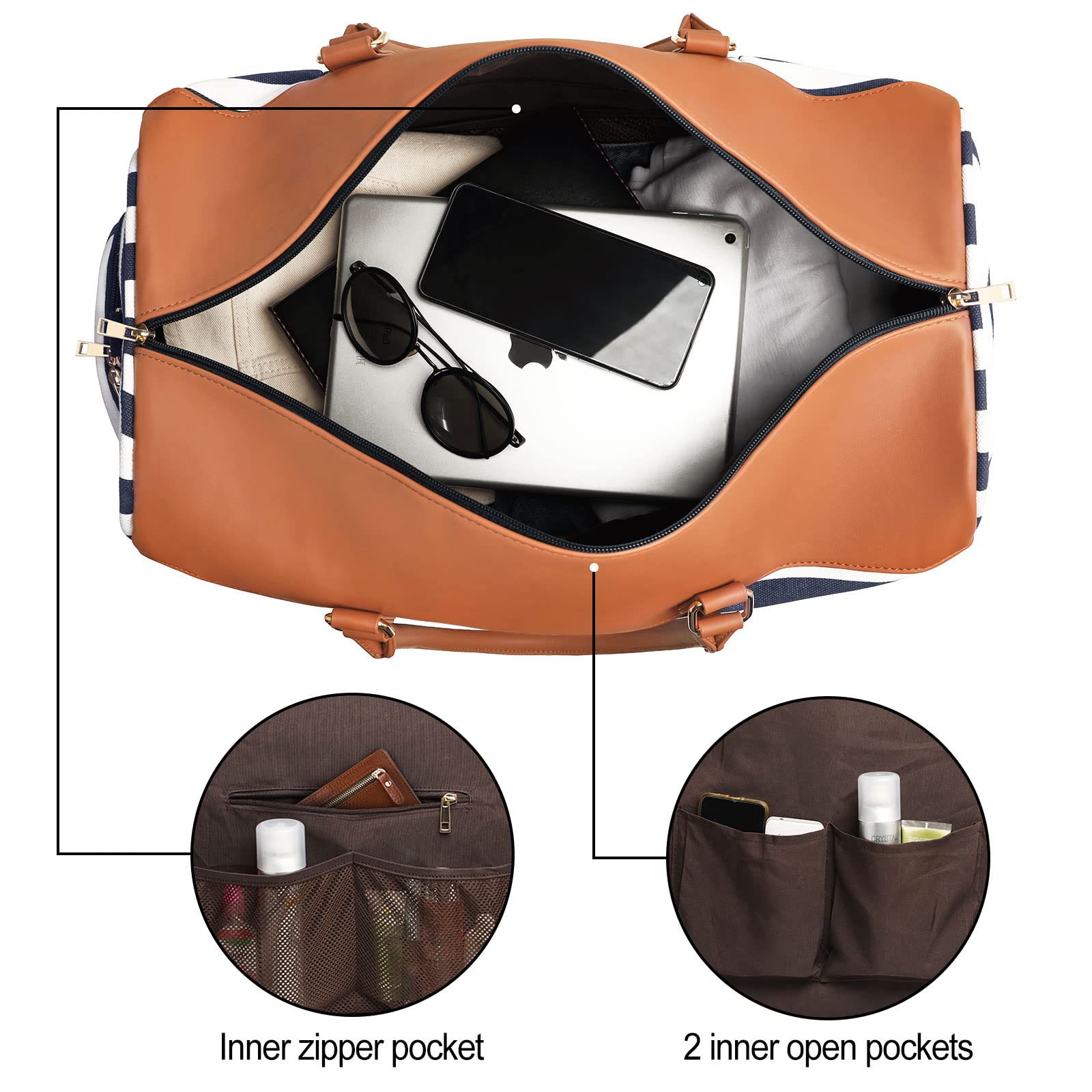 - Durable Weekender Bag- The large and spacious weekender bag is created with premium quality canvas and soft brown faux leather accents. The interior is finished with polyester lining that looks fantastic, internal compartment can arrange your different items perfectly.