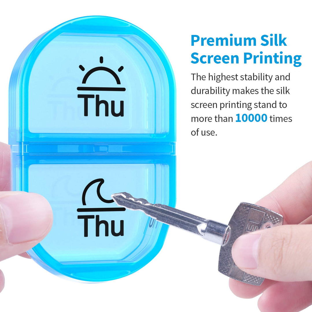 - Dual Protection: The outer case of the day and night pill organizer is designed as a depressed semicircle, which increases the pressure-bearing to protect the morning and night pill organizer placed in suitcase. The lid of each medication organizer twice a day is tight enough to hold the pills, never worry about the pills may spill out accidently.