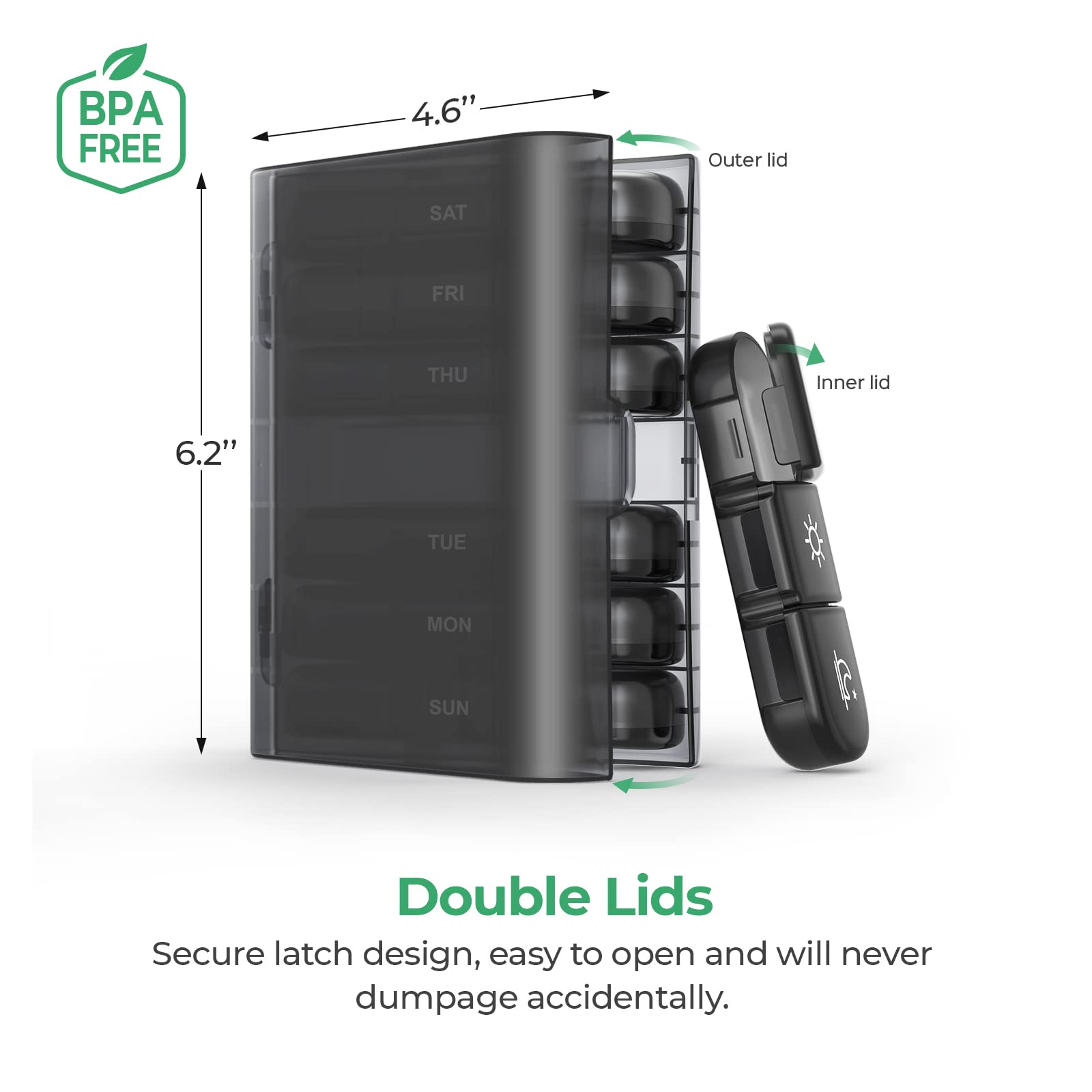 - Track Your Medication: Pill container (morning, noon and night) sort your pills 3 times a day; larger black shell can accommodate 7 independent pill box organizer to plan the pills for a week. Separate pill holder, this pill dispenser has 7 movable vitamin organizers, which can be taken out separately every day for your on the go use.