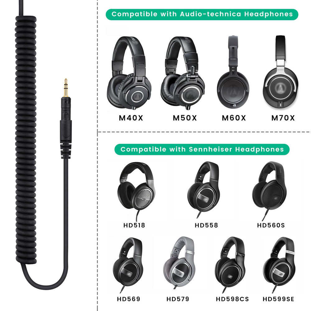 Compatibility: The coiled audio cable well used for Audio-technica ATH-M50X, ATH-M70X, ATH-M40X gaming headsets, also fitted to Sennheiser headphones HD598, HD598CS, HD598 SR, HD599, HD599 SE, HD569, HD579, HD518, HD518 SR, HD558, HD560 S.