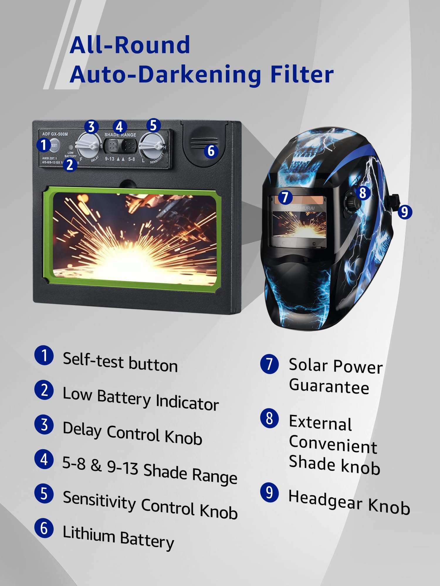 1. The Auto Darkening Filter enables welders to adapt to various working environments by controlling the shade of the lens.