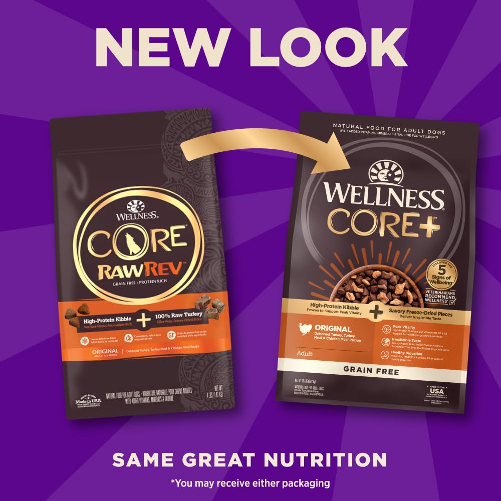 - Original Dry – CORE+ (Formerly RawRev) Dry Dog Food with Freeze Dried Pieces, Grain Free, High Protein, Natural, Original Turkey & Chicken Recipe, (20-Pound Bag) by Wellness