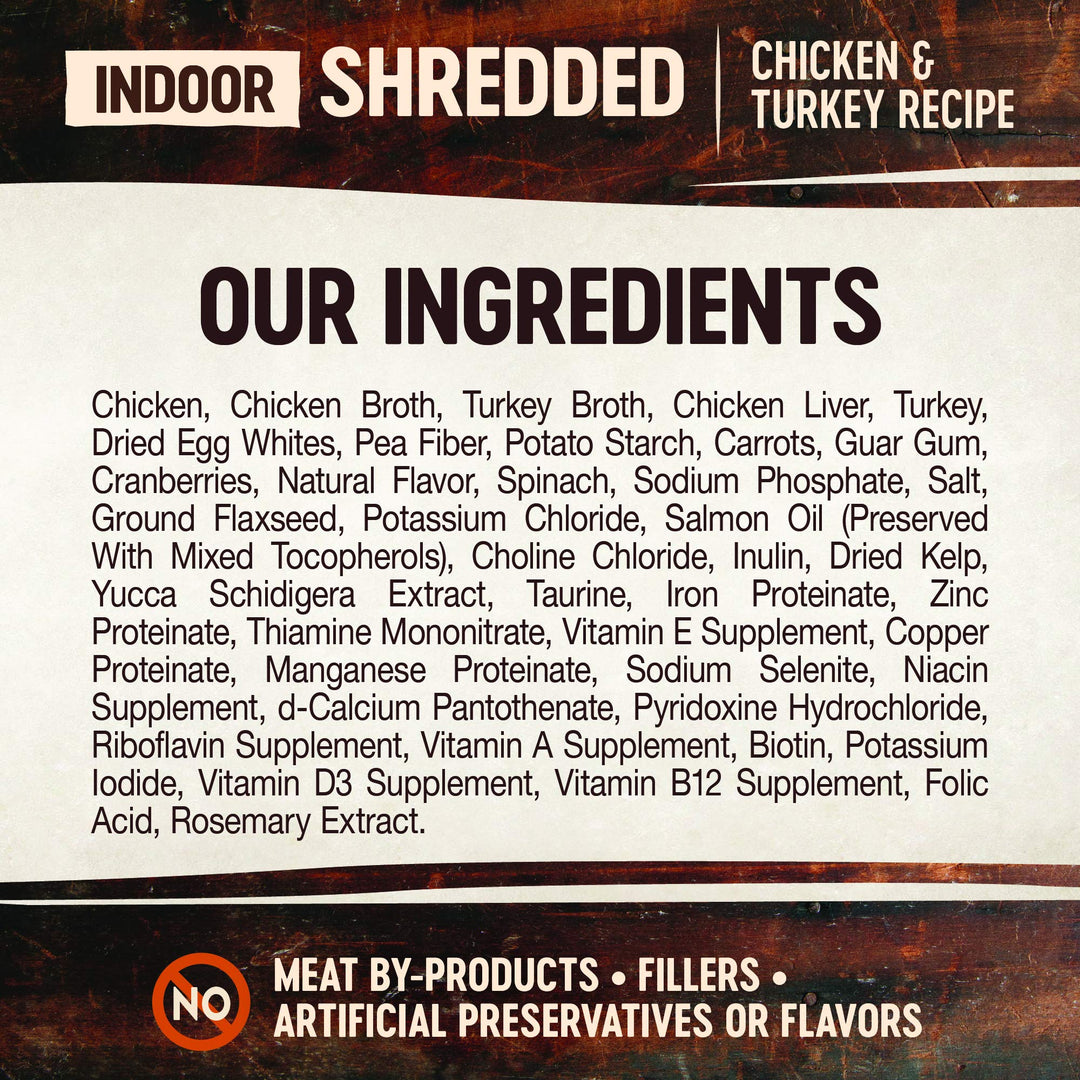 - SHREDDED Chicken & Turkey: This natural, grain-free recipe features Chicken & Turkey served with a savory, light gravy to satisfy even the most refined palate.