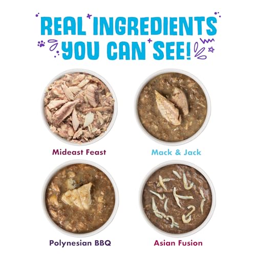 | ingredients | Can One (Mideast Feast): Tuna, Water Sufficient For Processing, Tilapia, Potato Starch, Sunflower Seed Oil, Calcium Lactate, Xanthan Gum, Tricalcium Phosphate, Choline Chloride, Taurine, Vitamin E Supplement, Zinc Sulfate, Thiamine Mononitrate (Vitamin B1), Nicotinic Acid (Vitamin B3), Calcium Pantothenate, Vitamin A Supplement, Manganese Sulfate, Riboflavin Supplement (Vitamin B2), Pyridoxine Hydrochloride (Vitamin B6), Copper Sulfate, Ferrous Sulfate, Folic Acid, Potassium Iodide, Vitamin D3 Supplement, Menadione Sodium Bisulfite Complex (Source of Vitamin K), Biotin, Vitamin B12 Supplement. Can Two (Mack & Jack): Water Sufficient For Processing, Tuna Red Meat, Mackerel, Skipjack, Sunflower Seed Oil, Locust Bean Gum, Calcium Lactate, Guar Gum, Tricalcium Phosphate, Potassium Chloride, Choline Chloride, Taurine, Zinc Sulfate, Vitamin E Supplement, Nicotinic Acid (Vitamin B3), Thiamine Mononitrate (Vitamin B1), Vitamin A Supplement, Calcium Pantothenate, Manganese Sulfate, Ferrous Sulfate, Copper Sulfate, Riboflavin Supplement (Vitamin B2), Pyridoxine Hydrochloride (Vitamin B6), Vitamin D3 Supplement, Folic Acid, Potassium Iodide, Menadione Sodium Bisulfite (Source of Vitamin K), Biotin, Vitamin B12 Supplement. Can Three (Asian Fusion): Tuna Red Meat, Water Sufficient For Processing, Shirasu, Sunflower Seed Oil, Calcium Lactate, Locust Bean Gum, Guar Gum, Tricalcium Phosphate, Potassium Chloride, Choline Chloride, Taurine, Zinc Sulfate, Vitamin E Supplement, Nicotinic Acid, Thiamine Mononitrate (Vitamin B1), Calcium Pantothenate, Vitamin A Supplement, Manganese Sulfate, Ferrous Sulfate, Copper Sulfate, Riboflavin Supplement (Vitamin B2), Pyridoxine Hydrochloride (Vitamin B6), Vitamin D3 Supplement, Folic Acid, Potassium Iodide, Menadione Sodium Bisulfite (Source of Vitamin K), Biotin, Vitamin B12 Supplement. Can Four (Polynesian BBQ): Water Sufficient For Processing, Sardine, Tuna, Red Bigeye, Sunflower Seed Oil, Locust Bean Gum, Guar Gum, Potassium Chloride, Choline Chloride, Taurine, Zinc Sulfate, Vitamin E Supplement, Nicotinic Acid, Thiamine Mononitrate (Vitamin B1), Vitamin A Supplement, Calcium Pantothenate, Riboflavin Supplement (Vitamin B2), Manganese Sulfate, Pyridoxine Hydrochloride (Vitamin B6), Copper Sulfate, Folic Acid, Potassium Iodide, Vitamin D3 Supplement, Menadione Sodium Bisulfite (Source of Vitamin K), Biotin, Vitamin B12 Supplement. |