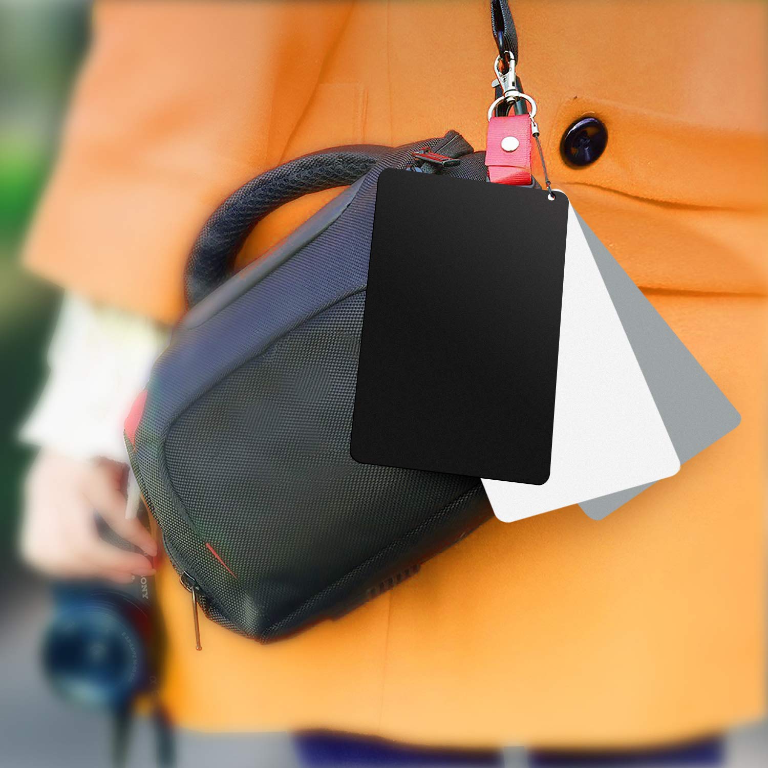 - Package: Including 3 card-Pure Black, Pure White and 18% Grey/Gray, also includes Premium Lanyard with a detachable clip.