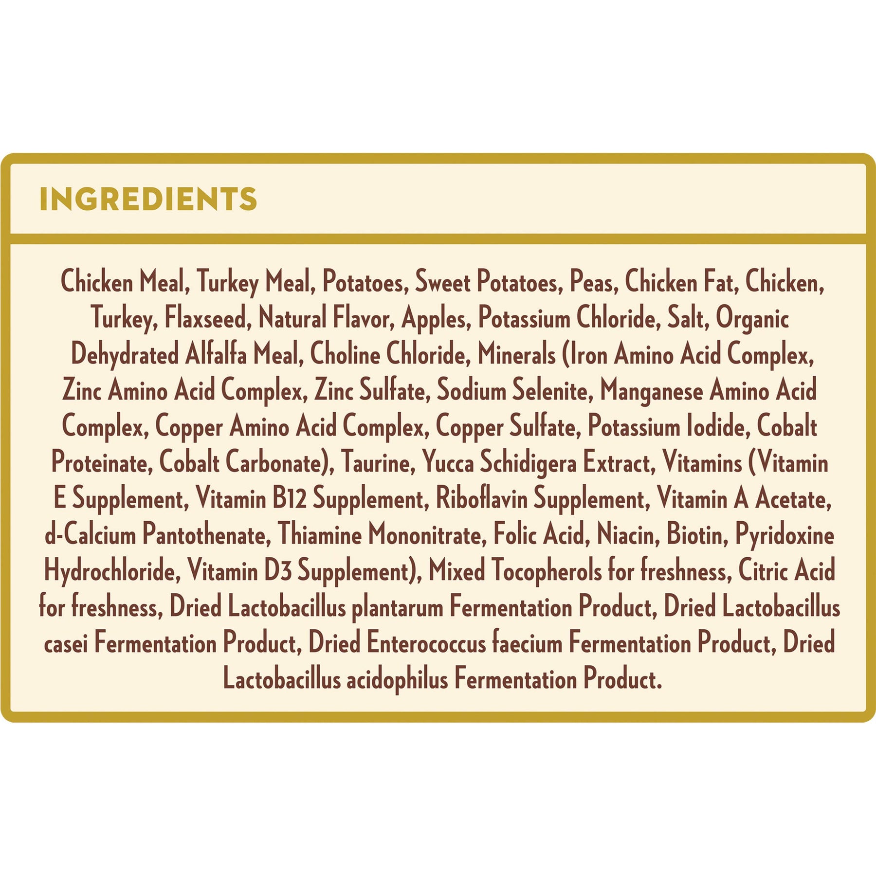 | ingredients | Chicken Meal, Potatoes, Canola Meal, Peas, Chicken Fat, Sweet Potato, Chicken, Turkey, Natural Flavor, Flaxseed, Apples, Carrots, Dried Beet Pulp, Dried Yeast, Potassium Chloride, Salt, Vitamins (Vitamin E Supplement, Vitamin B12 Supplement, Vitamin A Acetate, D-Calcium Pantothenate, Thiamine Mononitrate, Folic Acid, Riboflavin Supplement, Niacin, Pyridoxine Hydrochloride, Biotin, Vitamin D3 Supplement), Choline Chloride, Minerals (Iron Amino Acid Complex, Zinc Amino Acid Complex, Zinc Sulfate, Sodium Selenite, Manganese Amino Acid Complex, Copper Amino Acid Complex, Copper Sulfate, Potassium Iodide), Taurine, Mixed Tocopherols For Freshness, Citric Acid For Freshness, Dried Lactobacillus Plantarum Fermentation Product, Dried Lactobacillus Casei Fermentation Product, Dried Enterococcus Faecium Fermentation Product, Dried Lactobacillus Acidophilus Fermentation Product |