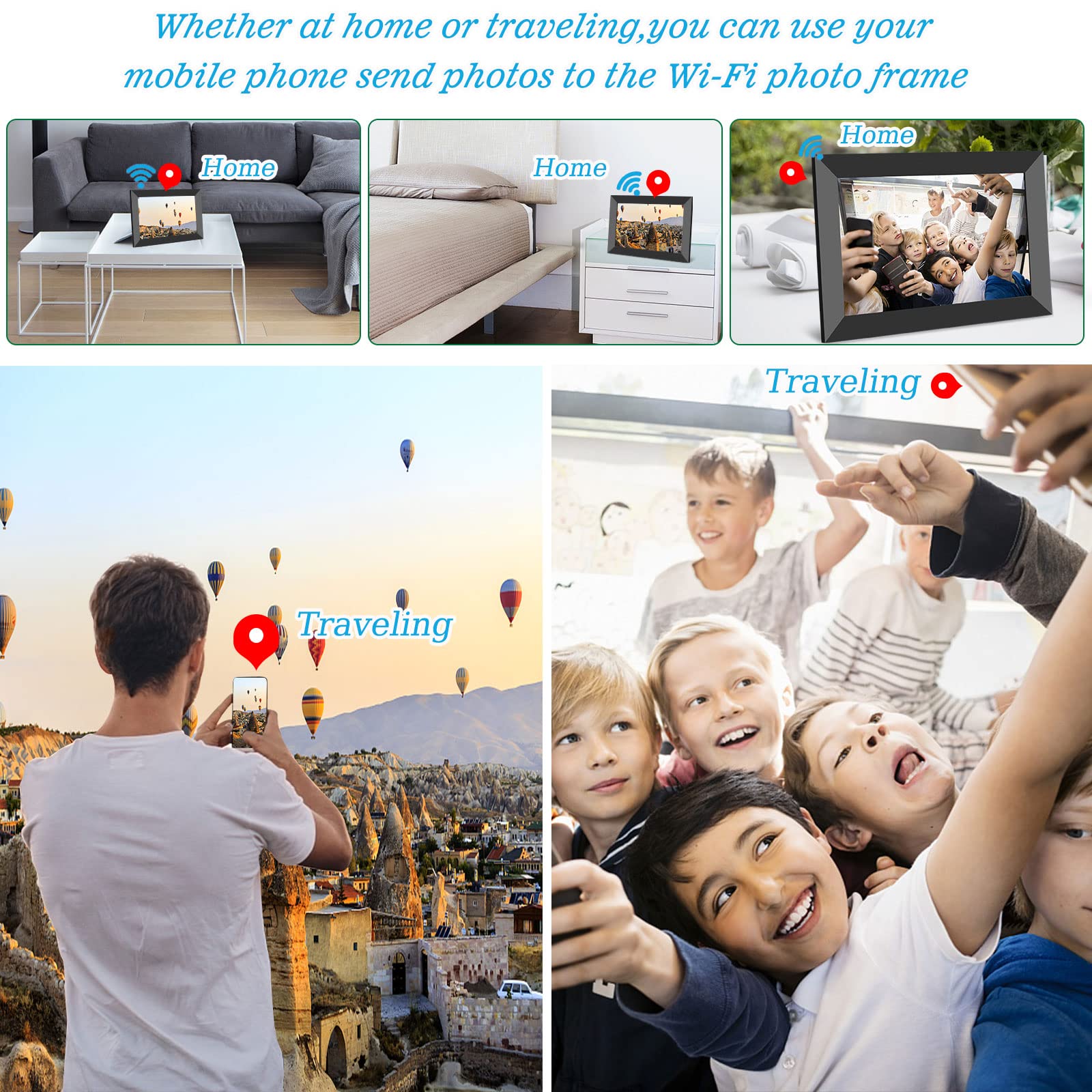 - Wi-Fi & APP CONNECTION: Connect the frame to Wi-Fi and sharing the wonderful moments through the free “Frameo APP” which available for both Android and iOS. You can send photos or small videos to the photo frame direct anytime anywhere, no need creating email account or no need Facebook