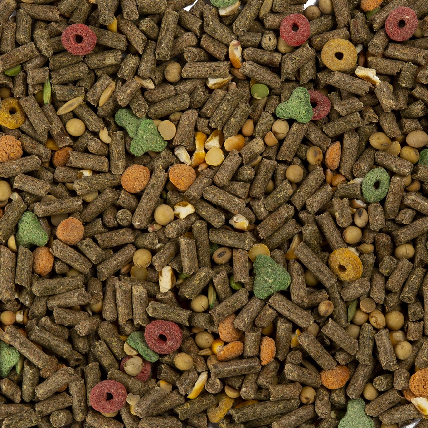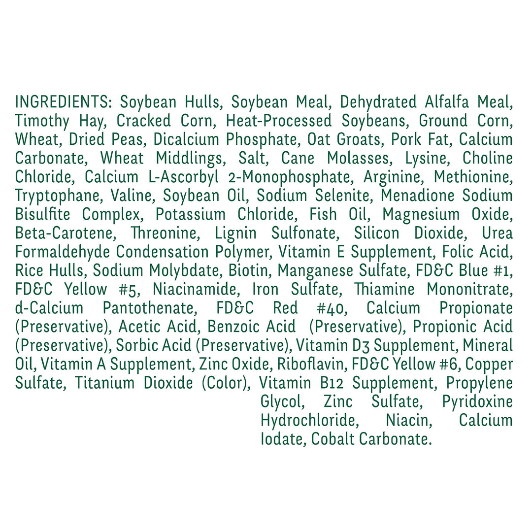 | ingredients | INGREDIENTS: Dehydrated Alfalfa Meal, Ground Timothy Hay, Heat-Processed Soybeans, Ground Corn, Wheat Middlings, Feeding Oatmeal, Soybean Meal, Oats, Cracked Corn, Wheat, Hulled Sunflower Seeds, Corn Gluten Meal, Peanuts, Dried Yellow Split Peas, Dried Green Split Peas, Dried Cranberries, Dried Carrot, Raisins, Soybean Oil, Dried Blueberries, Dried Apple, Dried Pineapple, Titanium Dioxide (color), Mineral Oil, Cane Molasses, Salt, Ground Limestone, Dicalcium Phosphate, Ascorbic Acid (source of Vitamin C), Choline Chloride, Vitamin A Acetate, Vitamin D3 Supplement, dl-Alpha Tocopheryl Acetate (Source of Vitamin E), Niacin, Riboflavin, Pyridoxine Hydrochloride, Thiamine Mononitrate, d-Calcium Pantothenate, Vitamin B12 Supplement, Menadione Sodium Bisulfite Complex (Source of Vitamin K), Folic Acid, Biotin, Magnesium Oxide, Ferrous Carbonate, Ferrous Sulfate, Zinc Oxide, Manganous Oxide, Copper Sulfate, Calcium Iodate, Cobalt Carbonate, Color Added: FD&C Red #40, FD&C Yellow #5, FD&C Blue #1, FD&C Yellow #6. |