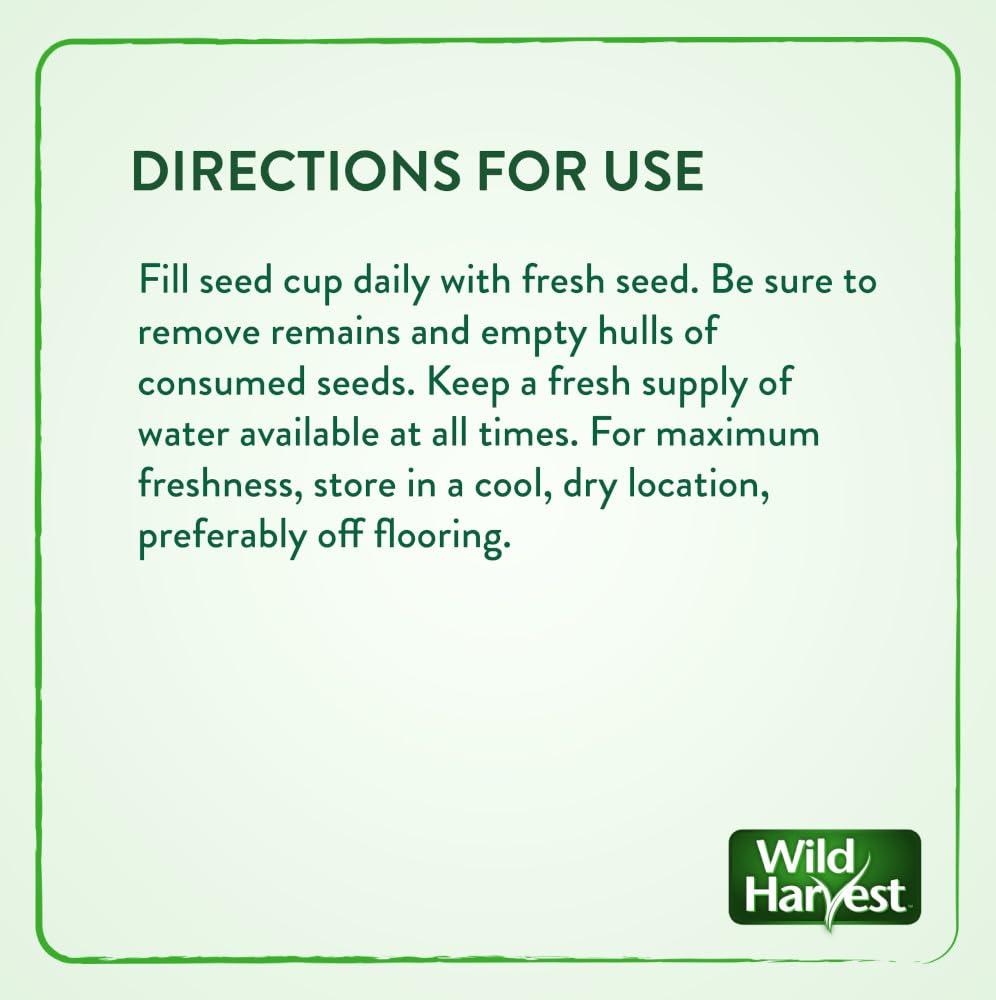 | directions | Fill seed cup daily with fresh seed. Be sure to remove remains and empty hulls of consumed seed. Keep a fresh supply of water available at all times. |