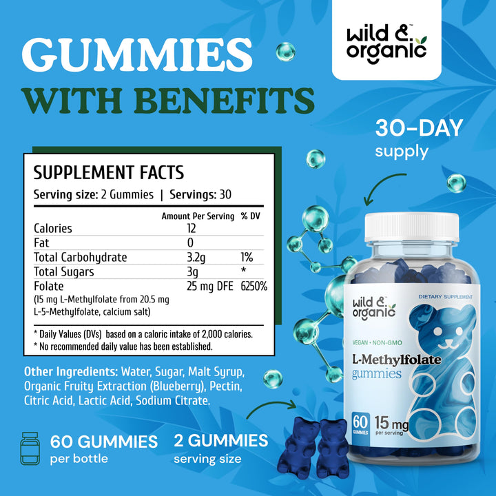 - 30-Day Supply: Each bottle contains 60 Wild & Organic 5-MTHF methylfolate chewables, providing a 30-day supply when taking two gummies per day.