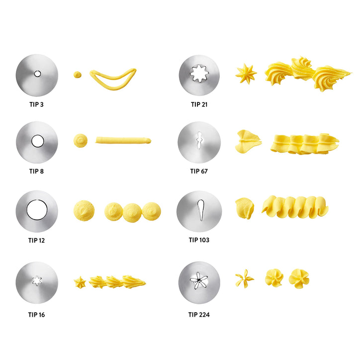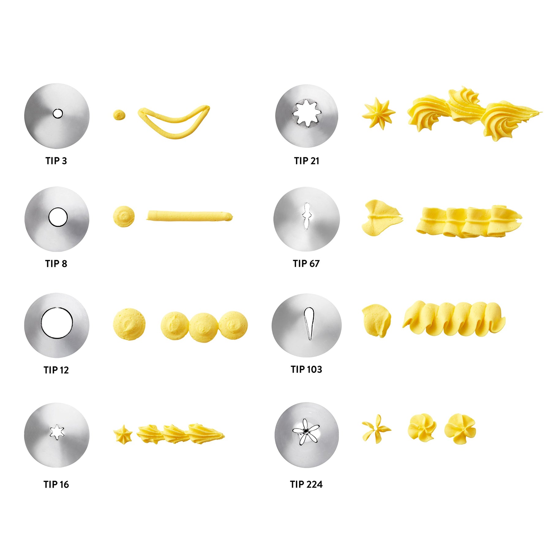 - INCLUDES: Wilton piping tips decorating kit includes round tip 3, round tip 8, round tip 12, star tip 16, star tip 21, drop flower tip 224, petal tip 103, leaf tip 67