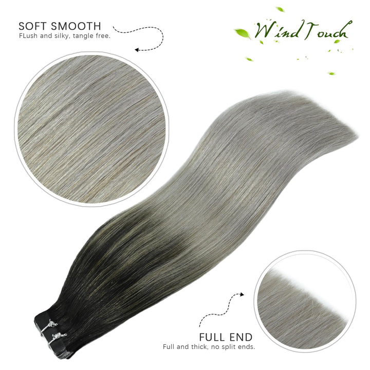- Original Hair Extensions – Tape In Hair Extensions Human Hair Double Sided Tape Skin Weft Balayage Ombre Hair Natural Black Fading to Silver Ash Blonde Hair Extensions Remy Hair #1btGray 50g 16Inch 20PCS Thick by WindTouch
