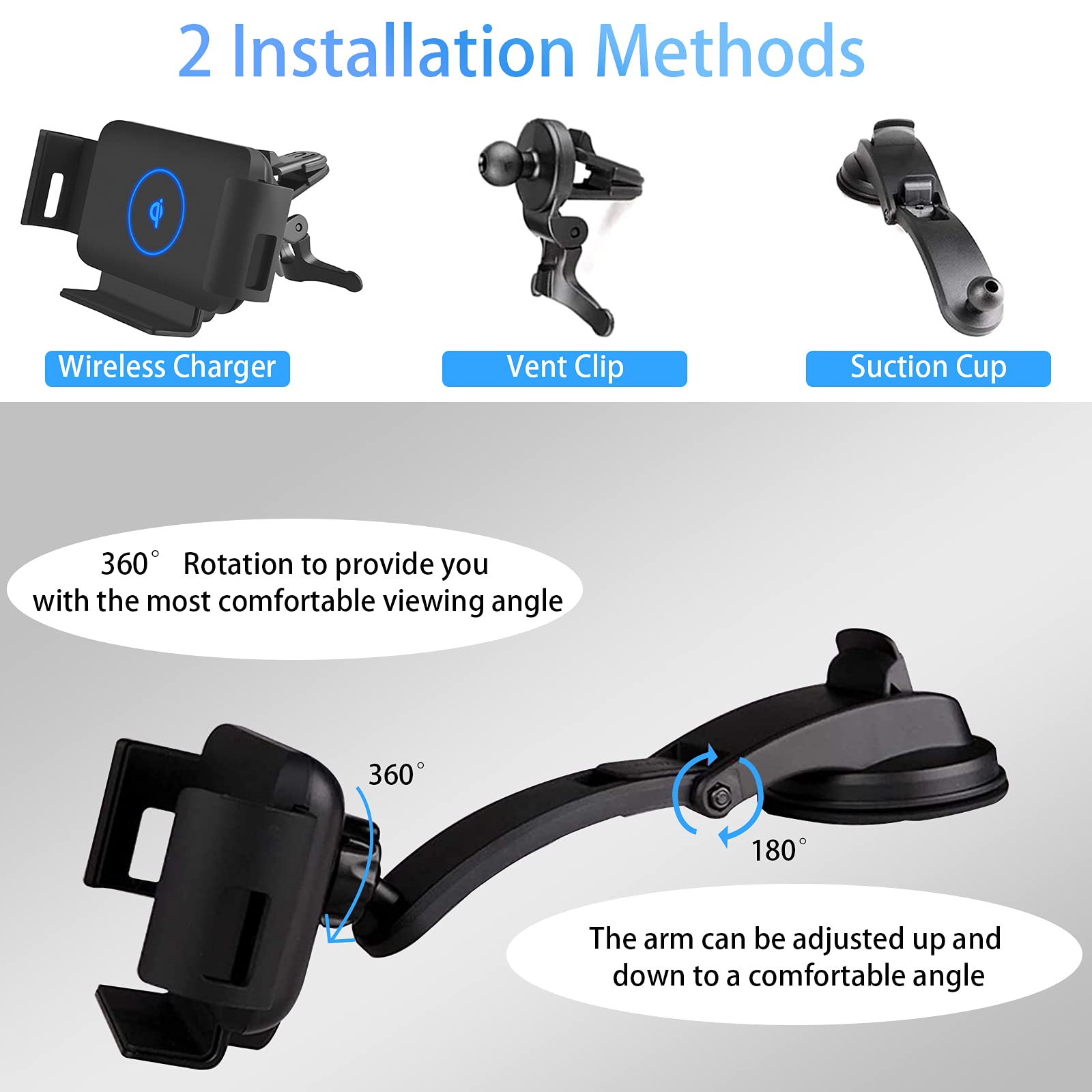 - Two Installation Methods - The car wireless charger can be installed on the dashboard and air outlet of the vehicle, with a suction cup base and air outlet clip. The sturdy suction cup base with viscous gel and anti-shake stabilizer can firmly fix the bracket to the dashboard without shaking.