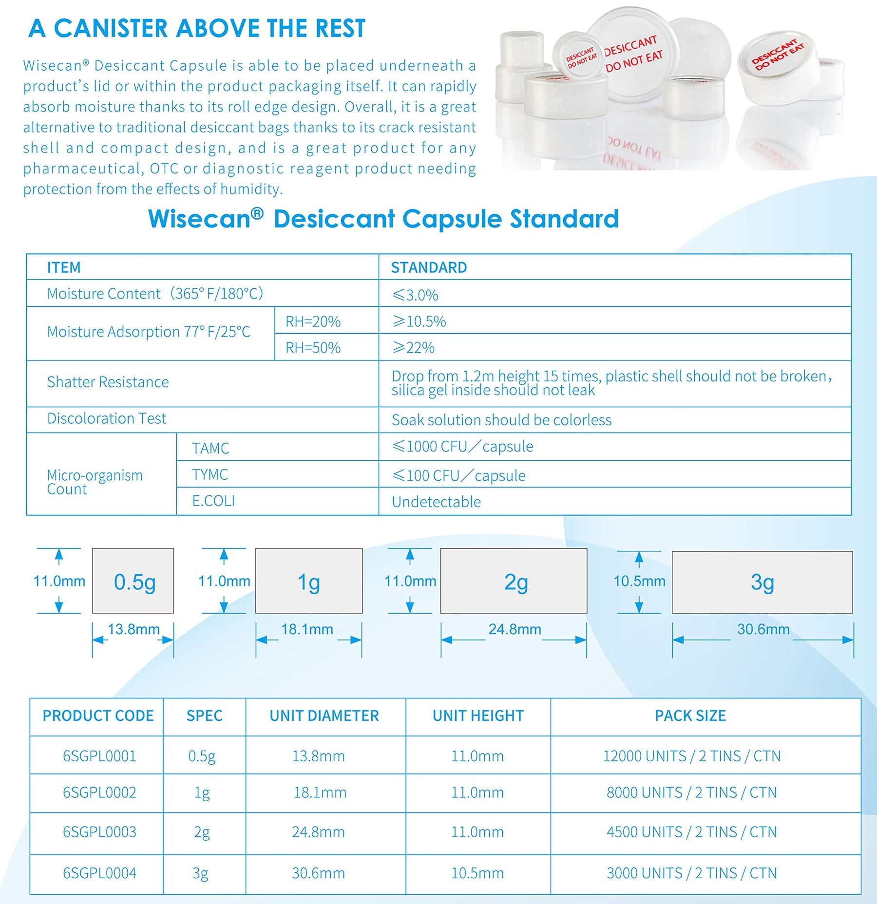 Wisecan Desiccant Capsule is able to be placed underneath a product’s lid or within the product packaging itself. It can rapidly absorb moisture thanks to its roll edge design. Overall, it is a great alternative to traditional desiccant bags thanks to its crack resistant shell and compact design, and is a great product for any , OTC or diagnostic reagent product needing protection from the effects of humidity.