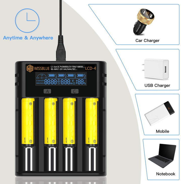 - UNIVERSAL CHARGER: Universal Usb Interface, You Can Use Solar Charger, Mobile Power, Computer, Car Charger, Usb Wall Charger, Etc. To Charge 18650 Batteries Anytime And Anywhere. Best 18650 Battery Charger 4 Slots, Suitable For Home Or Outdoor